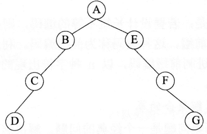 例如,一棵二叉树的中序序列和后序序列分别是DCBAEFG和DCBGFEA,请给出该二叉树的前序序列。该题可通过后序遍历确定二叉树的根结点,然后找到该数据值在前序序列中的位置,并用该位置的左部序列和后序序列中的相应序列构造左子树,用该位置的右部序列和后序序列中的相应序列构造右子树,如此不断地递归构造即可得到二叉树。建立的二叉树如下图所示。