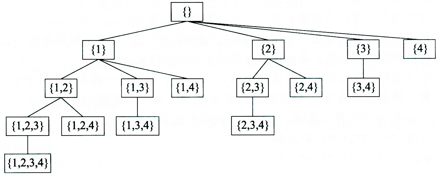 如何利用树状结构这个参照系来设计求集合{1,2,…,n}的幂集算法是我们讨论的重点。对于给定的集合{1,2,3,4},按幂集集合中的元素个数和字典次序建立的树如下图所示。