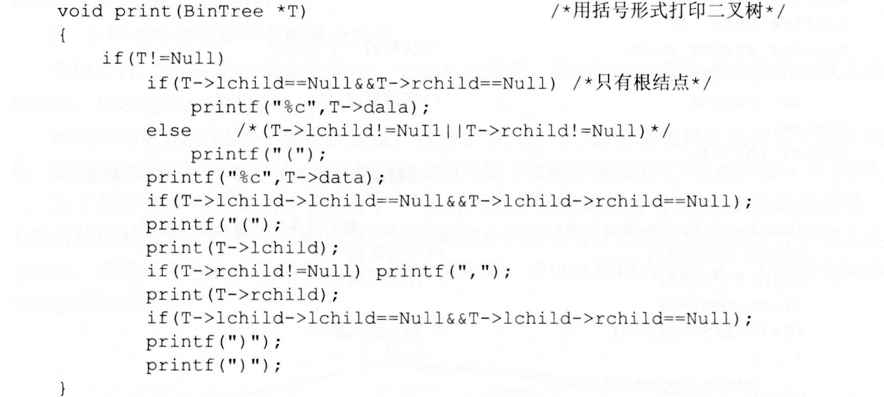 (1)以二叉链表为存储结构,写一算法用括号形式(key,LT,RT)打印二叉树,其中key是根结点数据,LT和RT分别是括号形式的左右子树。并且要求:空树不打印任何信息,一个结点x的树打印形式是x,而不应是(x,)的形式。代码如下: