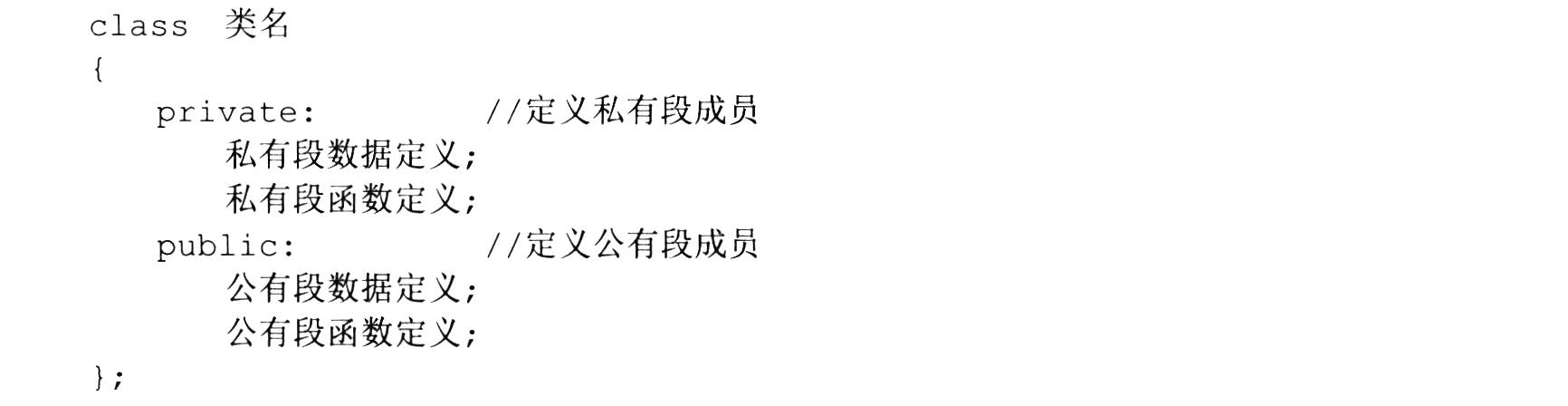 类定义包含两部分:类头(Class Head),由关键字class及其后面的类名构成;类体(Class Body),由一对花括号包围起来。类定义后面必须接一个分号或一列声明。一个类类型中可以有两种成员:数据和操作。在C++语言中称它们为数据成员和成员函数。根据它们的被访问权限,成员又可以分为私有段成员、保护段成员和公有段成员。例如: