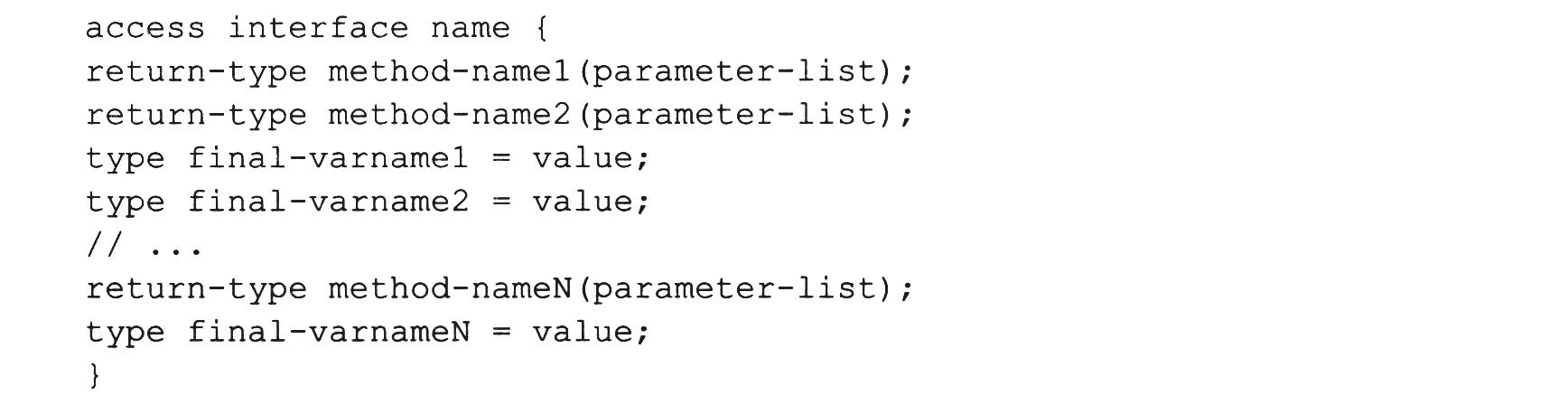 其中,access要么是public,要么就没有用修饰符。当没有访问修饰符时,则是默认访问范围。当它声明为public时,则接口可以被任何代码使用。name是接口名,它可以是任何合法的标识符。注意定义的方法没有方法体。它们以参数列表后面的分号作为结束。它们本质上是抽象方法;在接口中指定的方法没有默认的实现。每个包含接口的类必须实现所有的方法。接口声明中可以声明变量。它们一般是final和static型的,意思是它们的值不能通过实现类而改变。它们还必须以常量值初始化。如果接口本身定义成public,所有方法和变量都是public。