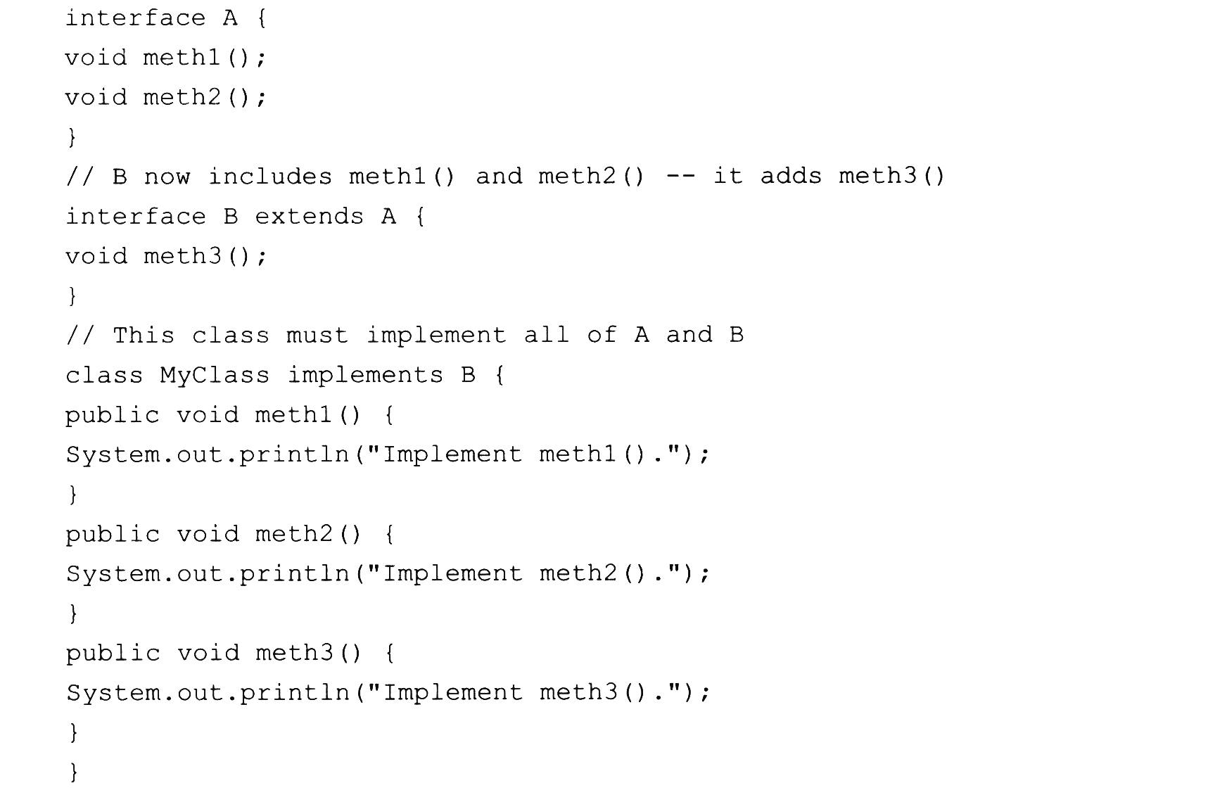 接口可以通过运用关键字extends被其他接口继承。语法与继承类是一样的。当一个类实现一个继承了另一个接口的接口时,它必须实现接口继承链表中定义的所有方法。例如: