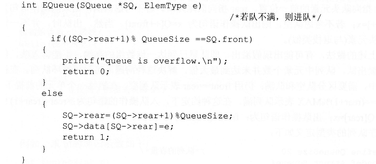顺序存储结构采用一维数组(向量)实现,设队列头指针front和队列尾指针rear,并且假设front指向队头元素的前一位置,rear指向队尾元素。若不考虑队满,则入队操作语句为Q[rear++]=x;若不考虑队空,则出队操作语句为x=Q[++front]。当然,出队时,并不一定需要队头元素(与退栈类似)。