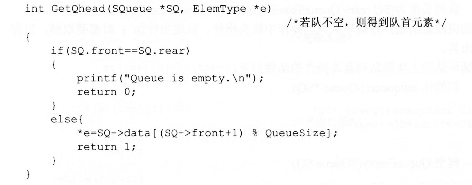 5)取队首元素GetQhead(SQueue *SQ, ElemType *e)