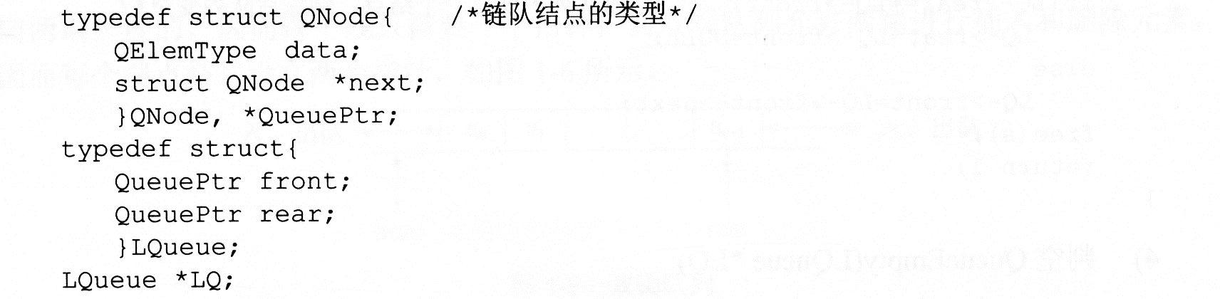 .队头指针为LQ->front,队尾指针为LQ->rear,队头元素的引用为Q->front->data,队尾元素的引用为LQ->rear->data。