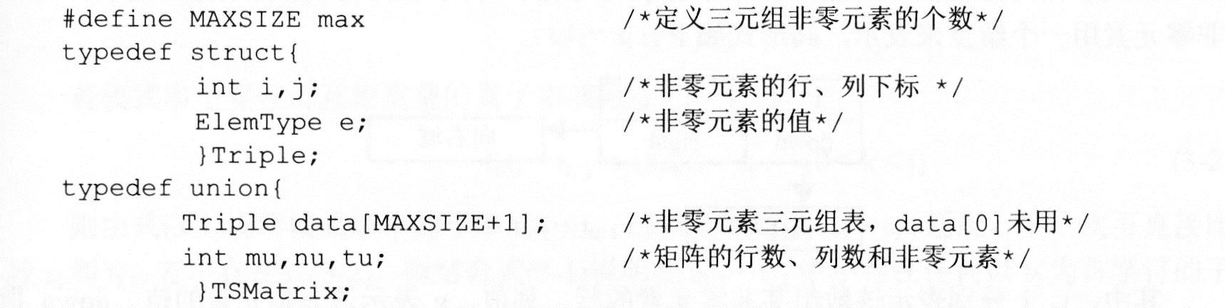 稀疏矩阵是指矩阵中非零元素很少且分布没有规律。设二维数组Am×n有N个非零元素,N<ij]来表示,其中,i,j,aij分别表示行、列位置和值。由此可见,稀疏矩阵可由表示非零元素的三元组和其行列数唯一确定。结点中除元素值外,还有元素所在行、列的信息。结点结构如下。