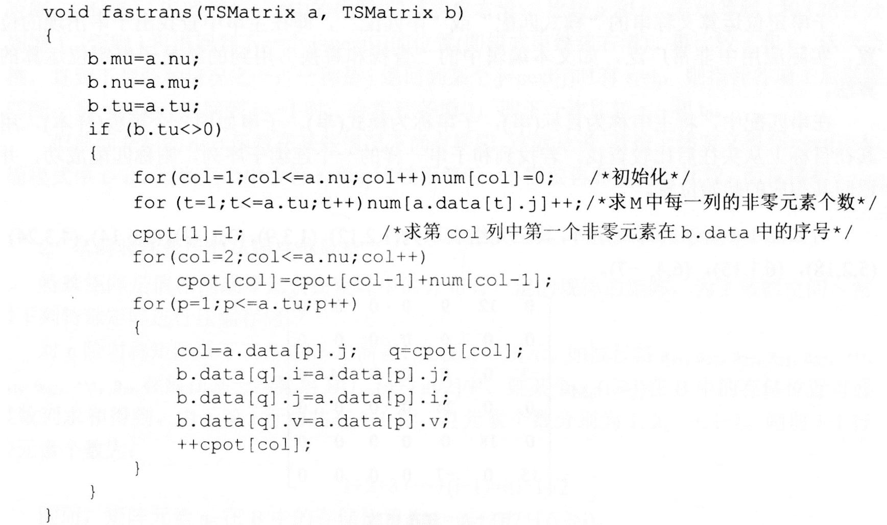 按a.data中三元组的次序进行转置,将转置后的三元组置入b中恰当的位置,如能预先确定M中每一列的第一个非零元在b.data中的相应位置,则转置时可直接放入b.data中恰当的位置。先求每一列非零元的个数,设num、cpot两个向量,num[col]表示M中第col列非零元个数,cpot[col]的初值表示M中第col列第一个非零元在b.data中的位置。