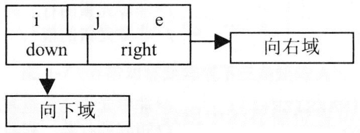 其中,i、j分别表示该数组某非零元素的行、列值,e表示该非零元素的值。down指向该行的下一行具有相同列的非零元素;right指向该列的下一列具有相同行的非零元素。此外用两个数组分别存储指向某行和某列第一个元素的指针。