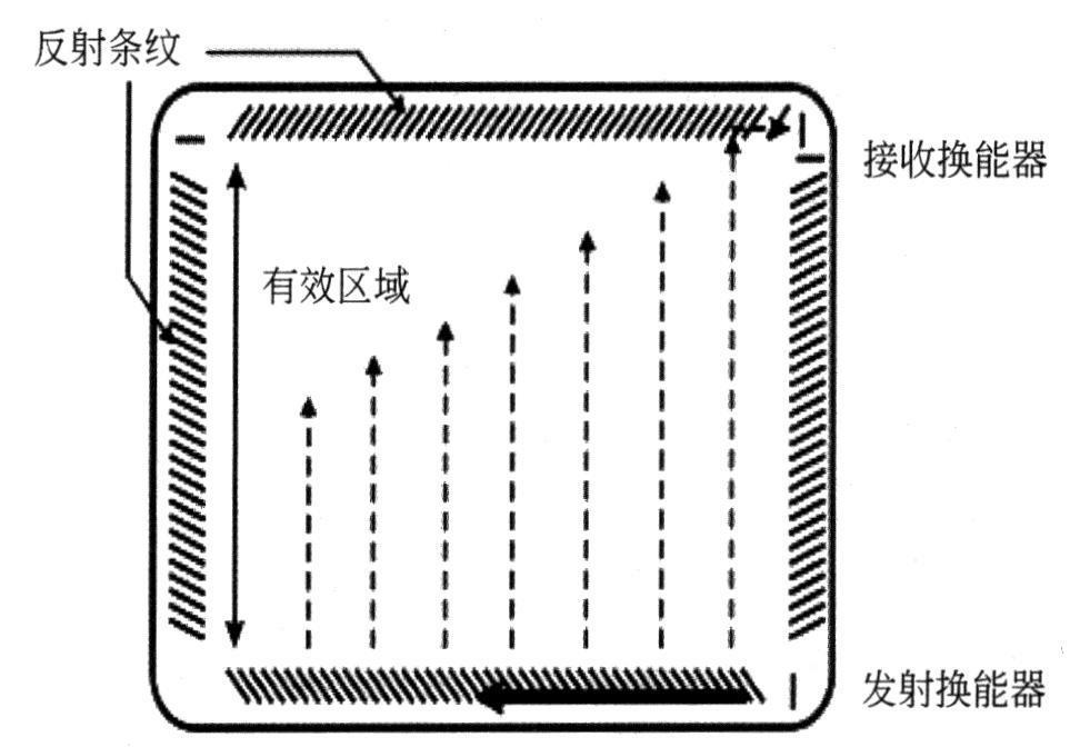 表面声波的触摸屏内有一个对X轴和Y轴的有发送和接收功能的压电传感器。压电控制器发送电信号至发射传感器,并在玻璃的表面将信号转换成超声波。通过反射器阵列,这些波将覆盖整个触摸屏。反射器收集和控制这些波至接收传感器,将它们转换成电信号,并对每个轴重复这个过程。用户触摸时吸收了传播的波的一部分,同时把接收到的XY坐标的信号与存储的数字分布图相比较,从而识别变化并计算出坐标。除了一般触摸屏都能响应的XY坐标外,表面声波触摸屏还能响应Z轴坐标,也就是能感知用户触摸压力的大小值,其原理是根据接收信号衰减处的衰减量而计算得到的。三轴一旦确定,控制器就把它们传送给主机。