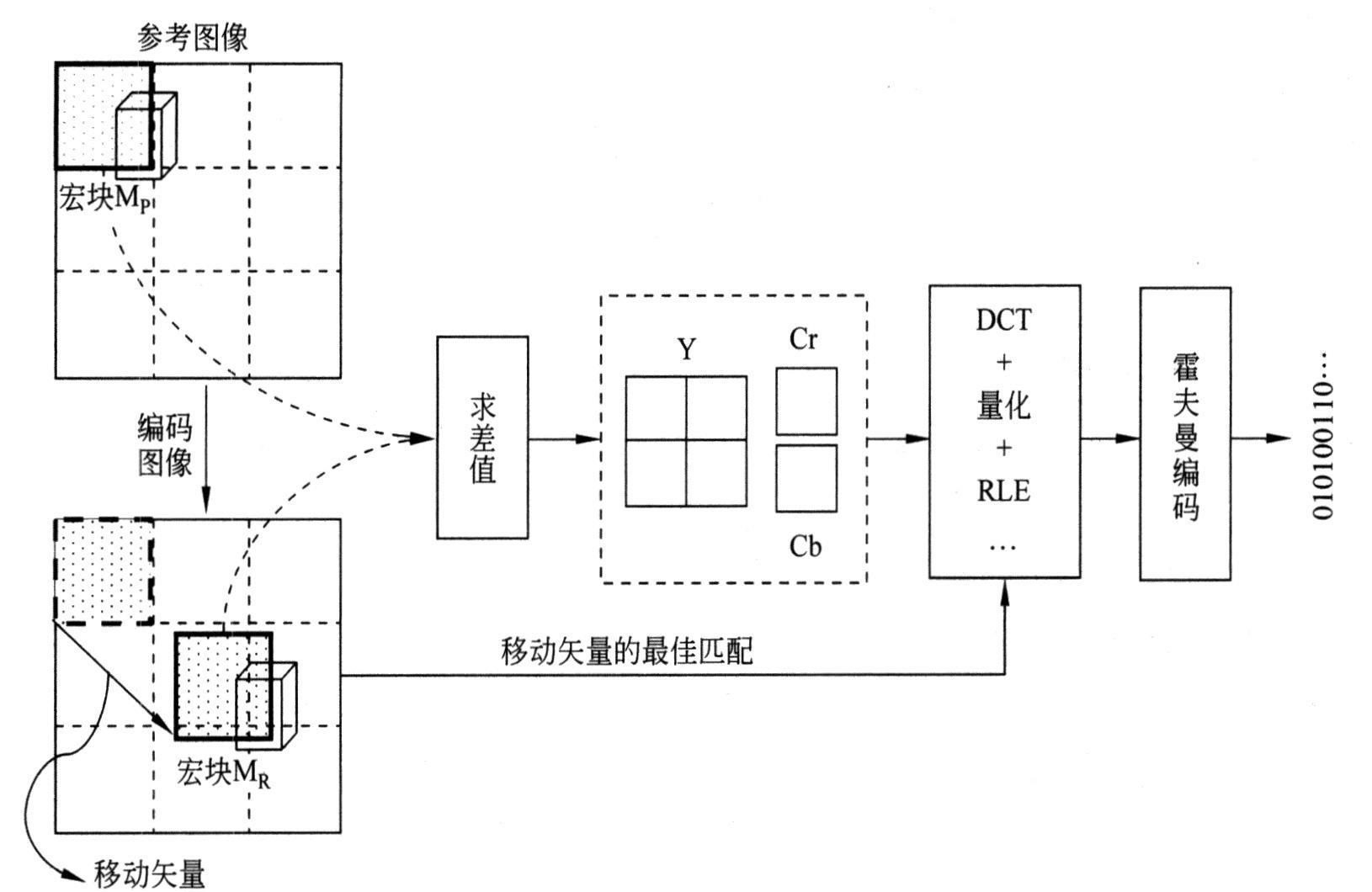 假设宏块MR是宏块MP的最佳匹配块,差值即为这两个宏块中相应像素值之差。对求得的差值进行彩色空间变换,然后使用4:1:1或4:2:0格式采样。对采样得到的Y、Cr和Cb分量值仿照JPEG压缩算法进行编码。
