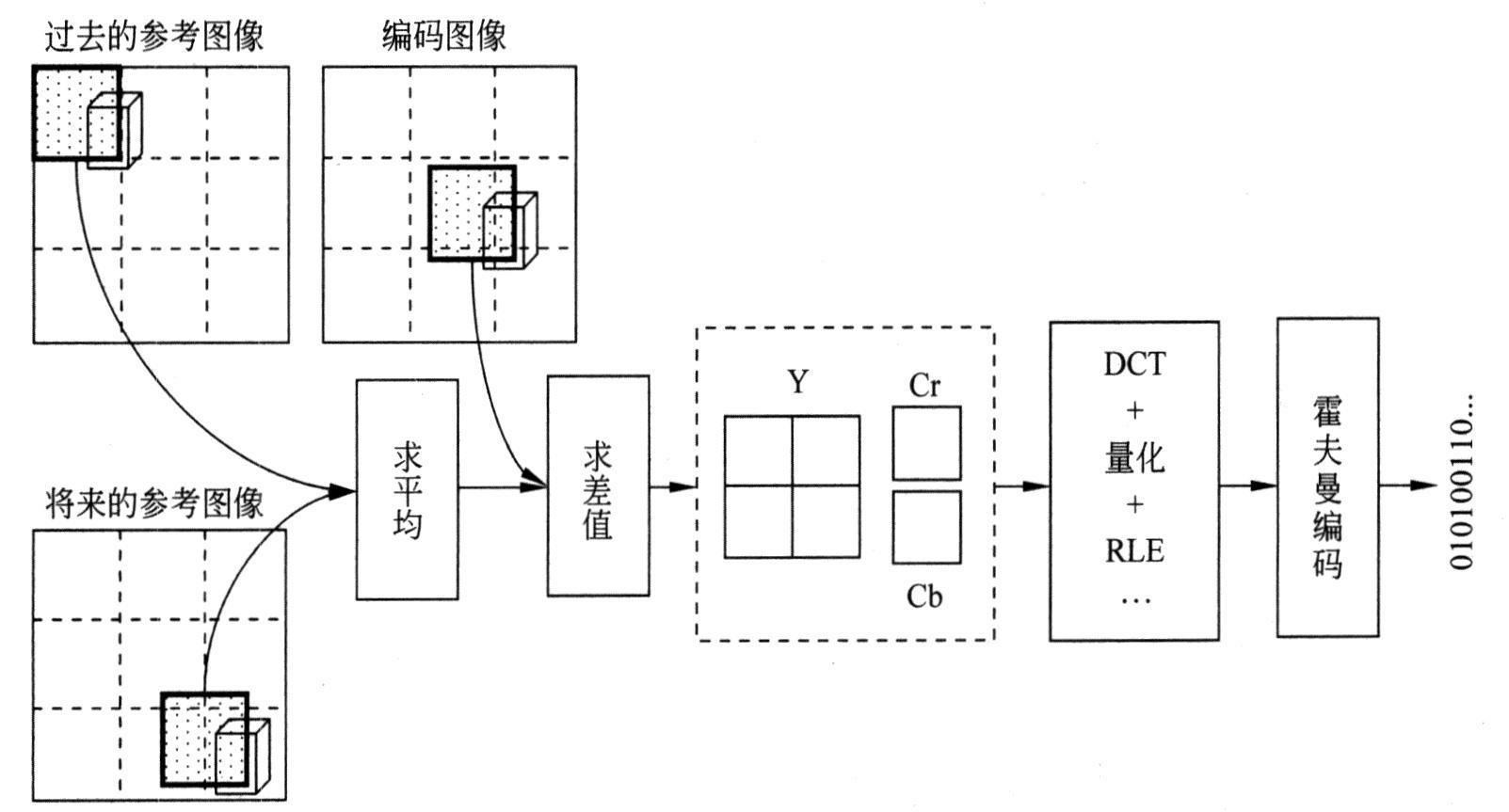 帧内图像I不参照过去的帧和将来的帧,而是采用与JPEG类似的压缩算法以减少空间的冗余数据。如果视像使用RGB空间表示,则首先要将其转换成YCrCb空间,然后再进行压缩编码。