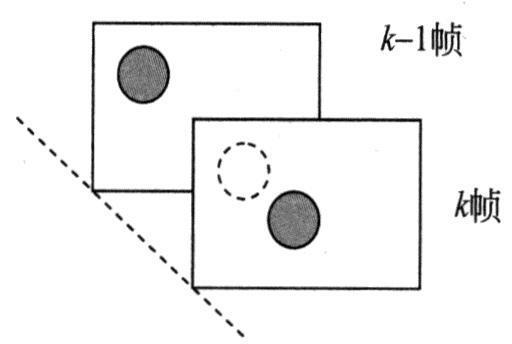采用预测编码的方法可以消除视频图像在时间上的相关性,即不直接传送当前帧的像素值,而是传送当前帧和其前一帧或后一帧的对应像素之间的差值。当图像中存在运动物体时,简单的预测不能收到良好的效果。例如在下图中,当前帧与前一帧的背景完全一样,只是小球平移了一个位置,如果简单地以第k-1帧像素值作为k帧的预测值,则在实线和虚线所示的圆内的预测误差都不为零。如果已经知道了小球运动的方向和速度,则可以从小球在k-1帧的位置推算出它在k帧中的位置,而背景图像(不考虑被遮挡的部分)仍以前一帧的背景代替,将这种考虑了小球位移的k-1帧图像作为k帧的预测值,就比简单的预测准确得多,从而可以达到更高的数据压缩比,这种预测方法称为具有运动补偿的帧间预测。