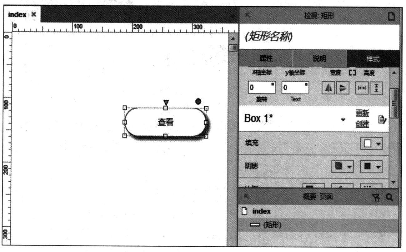 拖入一个矩形,设置其圆角角度,并输入文字“查看”;也可以在样式中单击“文字阴影”按钮,勾选“阴影”选项即可,如下图所示。