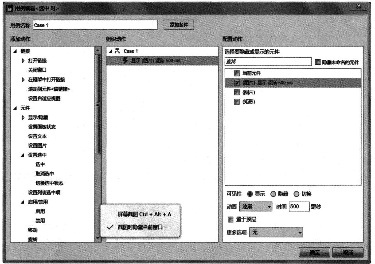 为“查看”按钮的“选中时”添加交互,设置为“显示”图片元件img,并且加上“逐渐”的动画效果,如下图所示。