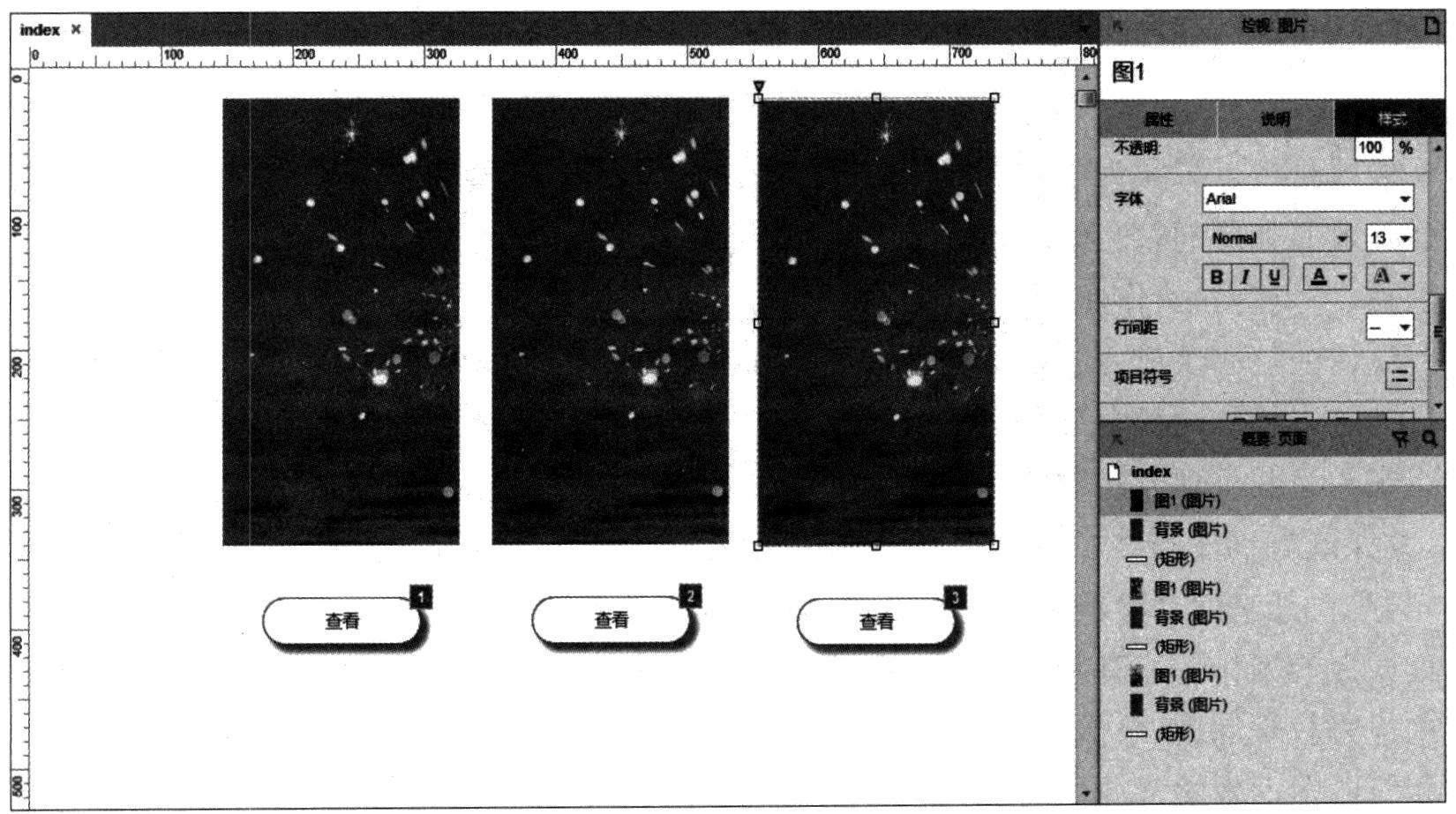 然后,拖入一个图片元件,双击导入图片,作为背景图片,并在背景图片上层再拖入一个图片元件,命名为img,导入首张查看时显示图片。最后将图片元件img设置为隐藏。