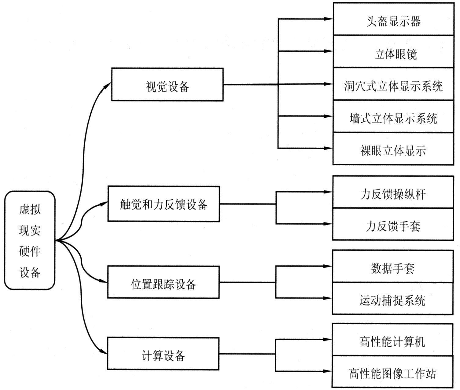 为了使虚拟环境有效地模拟现实环境,实现自然和谐的人机交互并使用户产生较强的沉浸感,虚拟现实系统需要特定的硬件和软件环境支撑。虚拟现实硬件设备可以分为视觉设备、触觉和力反馈设备、位置跟踪设备和计算设备,如下图所示。