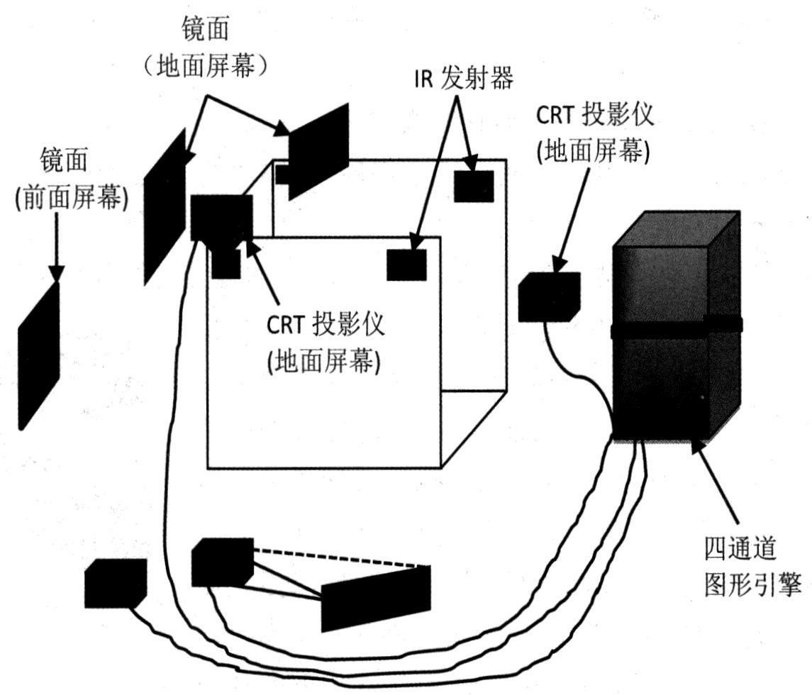 洞穴式立体显示系统使用投影系统投射多个投影面,形成房间式的空间结构,使得观察者周围具有多个图像画面显示,以增强沉浸感。