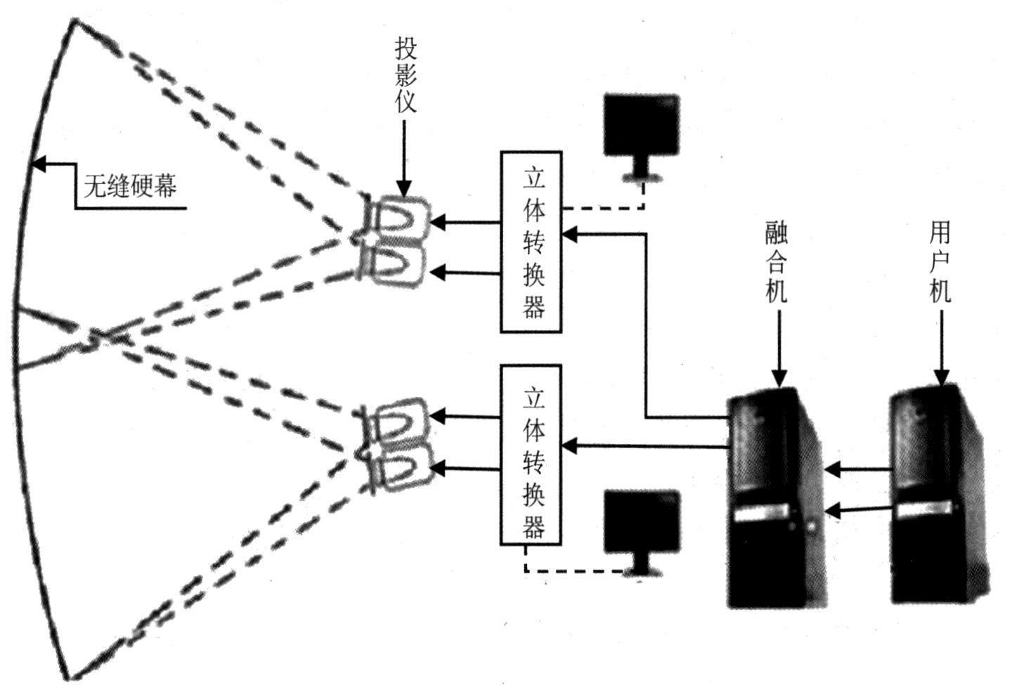 双通道和三通道立体虚拟仿真环幕投影大屏幕是虚拟三维投影显示系统中的一种沉浸式虚拟仿真显示环境,该系统采用边缘融合技术把多台投影机投射出的图像形成立体数字图像实时输出并显示在一个超大幅面的平面投影幕墙上,使观看者和参与者获得一种身临其境的虚拟仿真视觉感受。环幕投影显示屏幕的巨大弧度和显示特征导致了它的实现技术更为复杂性,需要多种核心技术作为整个系统的支撑,如数字几何矫正技术、多通道视景同步控制技术、边缘融合技术,从而形成一个具有极高分辨率、无任何变形失真的数字三维立体影像,如下图所示。