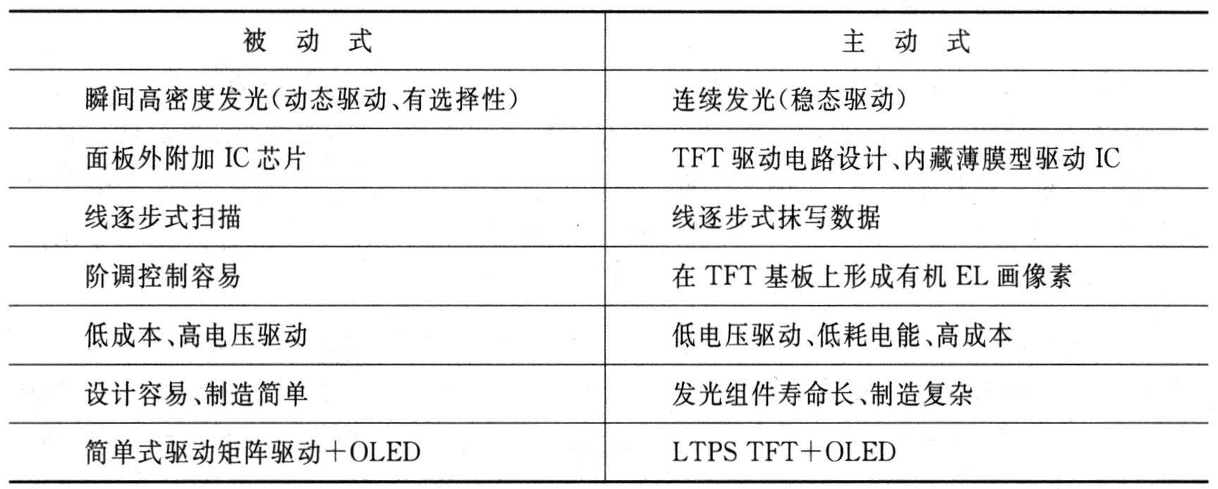 OLED的驱动方式分为主动式驱动(有源驱动)和被动式驱动(无源驱动)。二者的区别如下表所示。