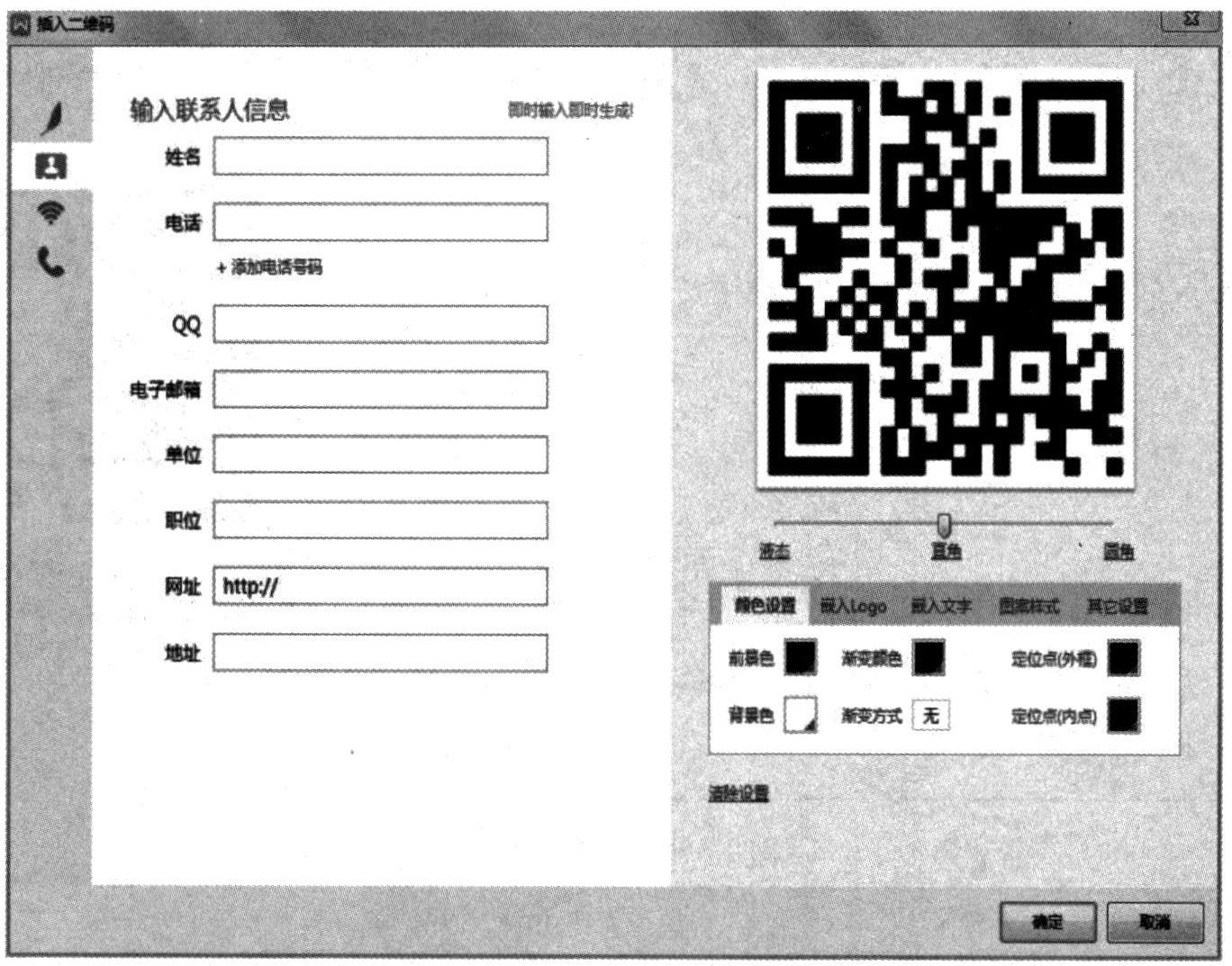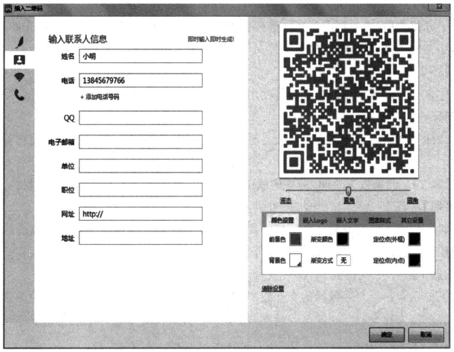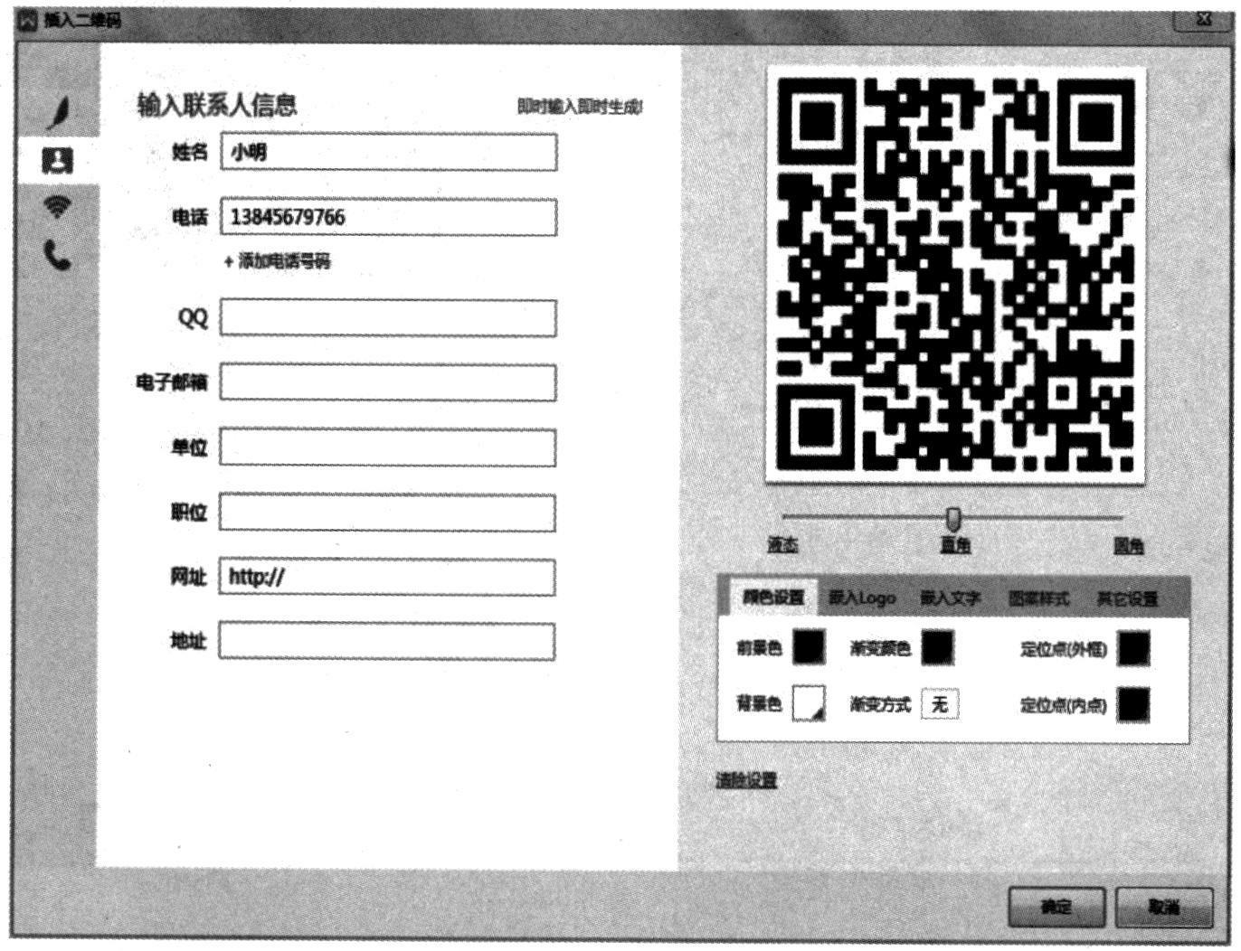 制作一个名片的二维码。在左边输入联系人的信息,每输入一个信息,二维码的图形都会发生相应的变化,即时输入,即时生成,如下图所示。