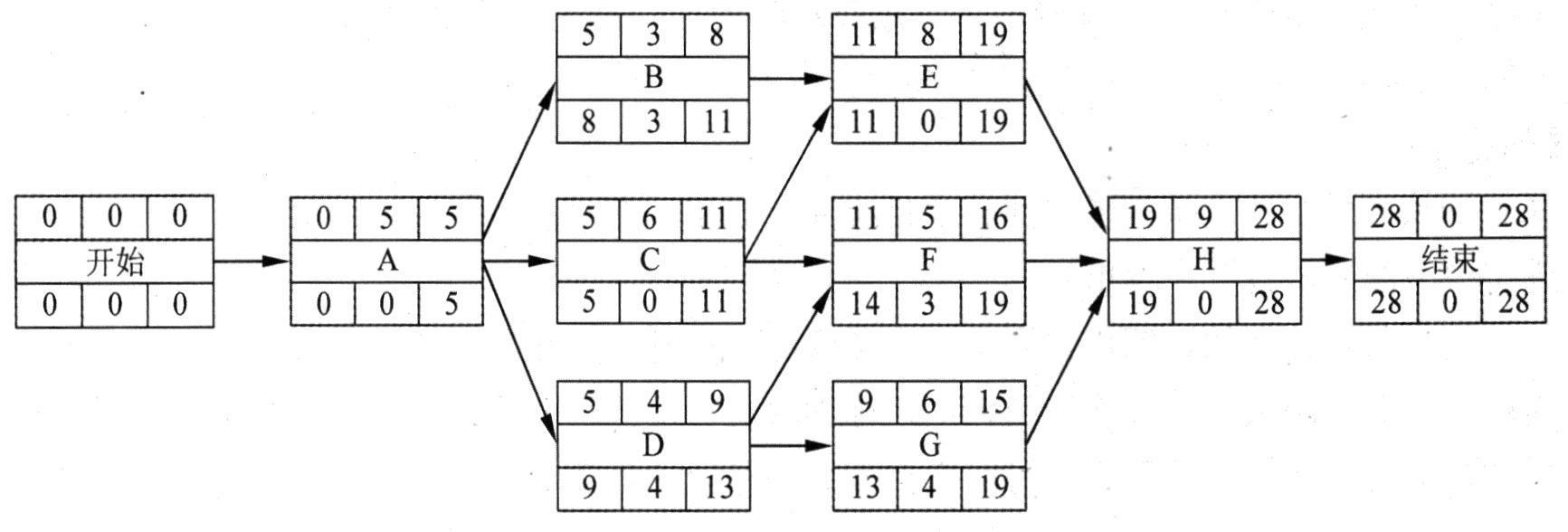 网络图结束节点的时间为28天,可以判断出该项目的总工期为28天。