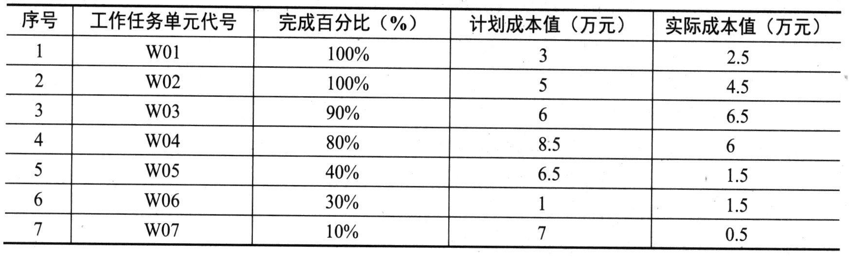 该题目是一道典型的挣值管理计算题目,题目以表格形式给出了项目各个活动与挣值计算相关的三个基本指标信息PV、EV和AC,其中PV与表格中的“计划成本值(万元)”相对应,AC与表格中的“实际成本值(万元)”相对应,EV与表格中的“完成百分比(%)”相对应。根据EV概念,EV是实际完成工作所对应的预算数值,此处的EV应该是对应的PV与完成百分比相乘的结果。