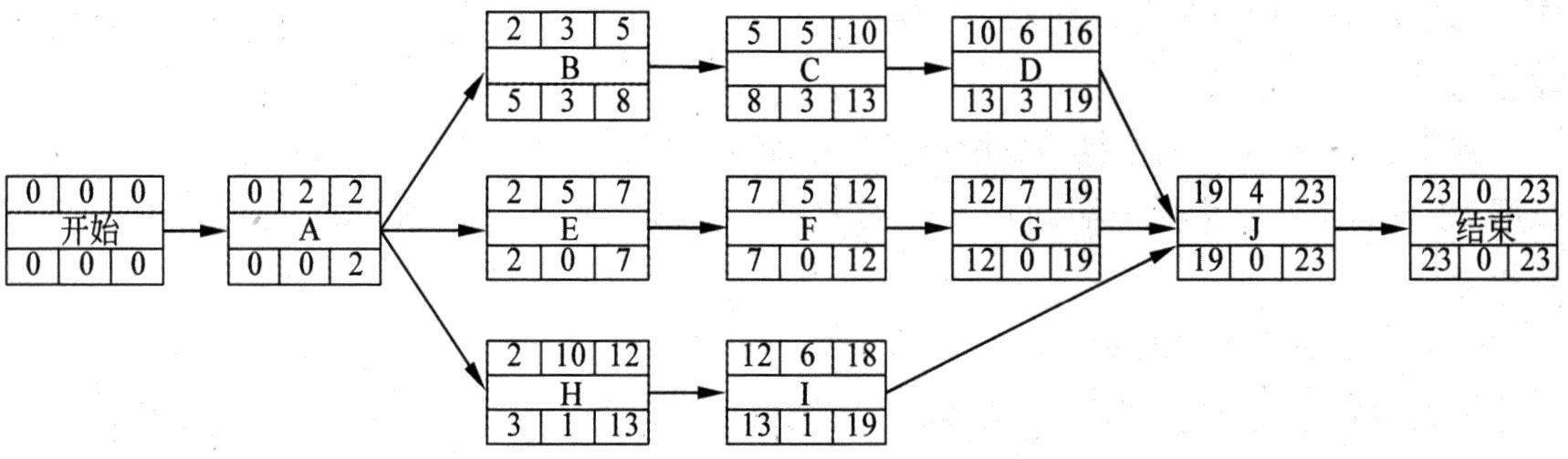 但根据题意,活动C和活动G由张工分别施工,所以该约束条件将导致活动G推后一天进行,活动G位于关键路径上,所以关键路径将由原来的23天调整为24天。需要注意的是,该工作包还预留了2天的储备工期,所以关键路径延后一天将不会影响该工作包在25天完成的进度目标。