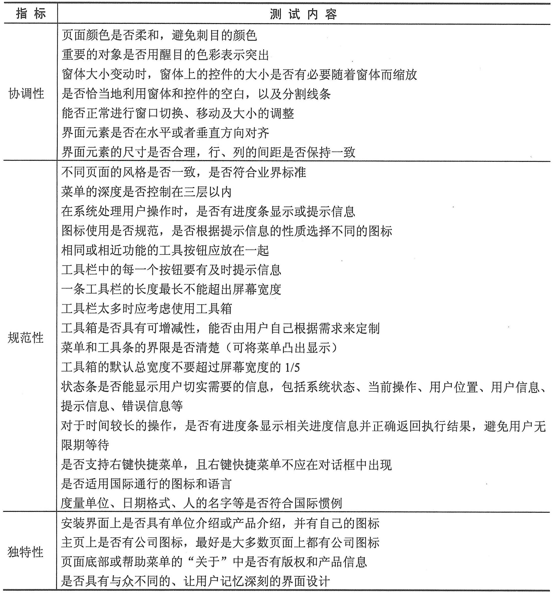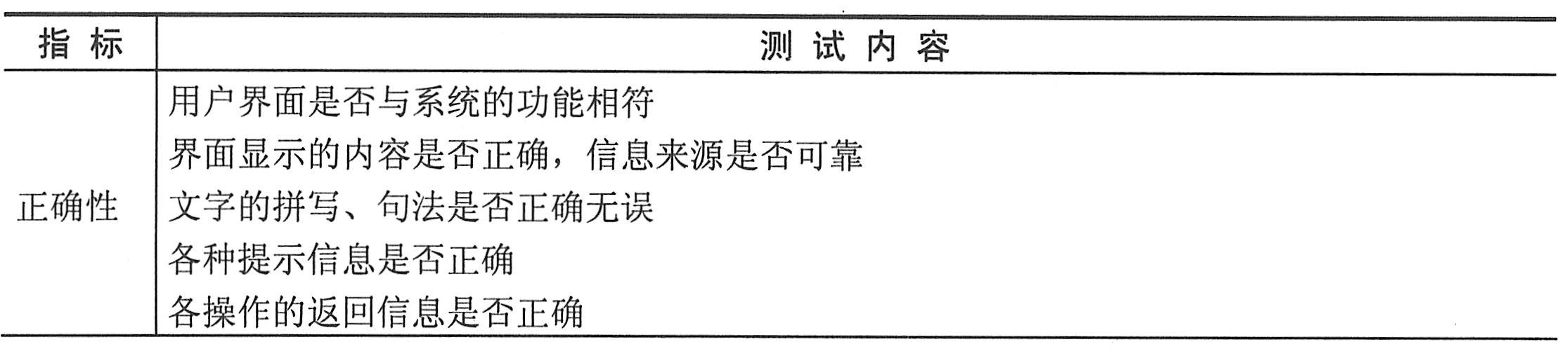 用户界面测试用于核实用户与软件之间的交互,检查用户界面中的设计是否合乎用户的期望或要求,界面中的对象是否按照预期的方式运行。对所有用户界面测试活动来说,都需要有外部人员最好是最终用户的参与。界面测试主要针对界面的正确性、导航性、易用性、协调性、规范性及独特性几个方面进行。界面测试首先要保证网站中每个页面为用户提供的功能和内容都是准确无误的,确保用户得到的信息是准确可靠的。对于Web应用系统来说,一个良好的导航能使用户方便快速地访问到他们所需的信息,因此,要对界面的导航性进行测试,这一点对于信息量大且结构复杂的网站尤为重要。导航测试的主要目的是确保用户能凭直觉方便快速地找到他们所需要的信息,提高网站的访问效率。这也是提高网站易用性的目的所在。为了使用户在访问网站时能舒适地享受系统提供的各种功能和服务,界面的美观与协调也是不可忽视的。通常,界面设计都应遵循业界的标准,其规范化程序越高,系统的易用性相应就越好;但在遵循统一标准的基础上,也要突出自己的个性,具有自己独特风格的界面给人印象深刻,能够吸引更多的用户,尤其在商业软件流通中有着很好的宣传作用。有关详细测试内容见下表。