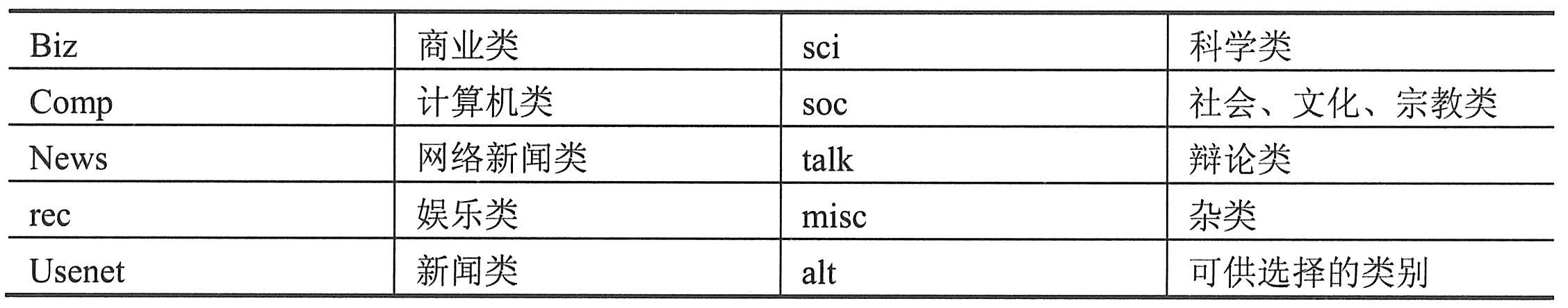 Usenet建立了一套命名规则以便人们方便地找到他所感兴趣的专题讨论小组。这套命名规则第一部分(名称中最左边的部分)确定专题小组所属的大类,称为顶级类别,约有10个(参见下表)。