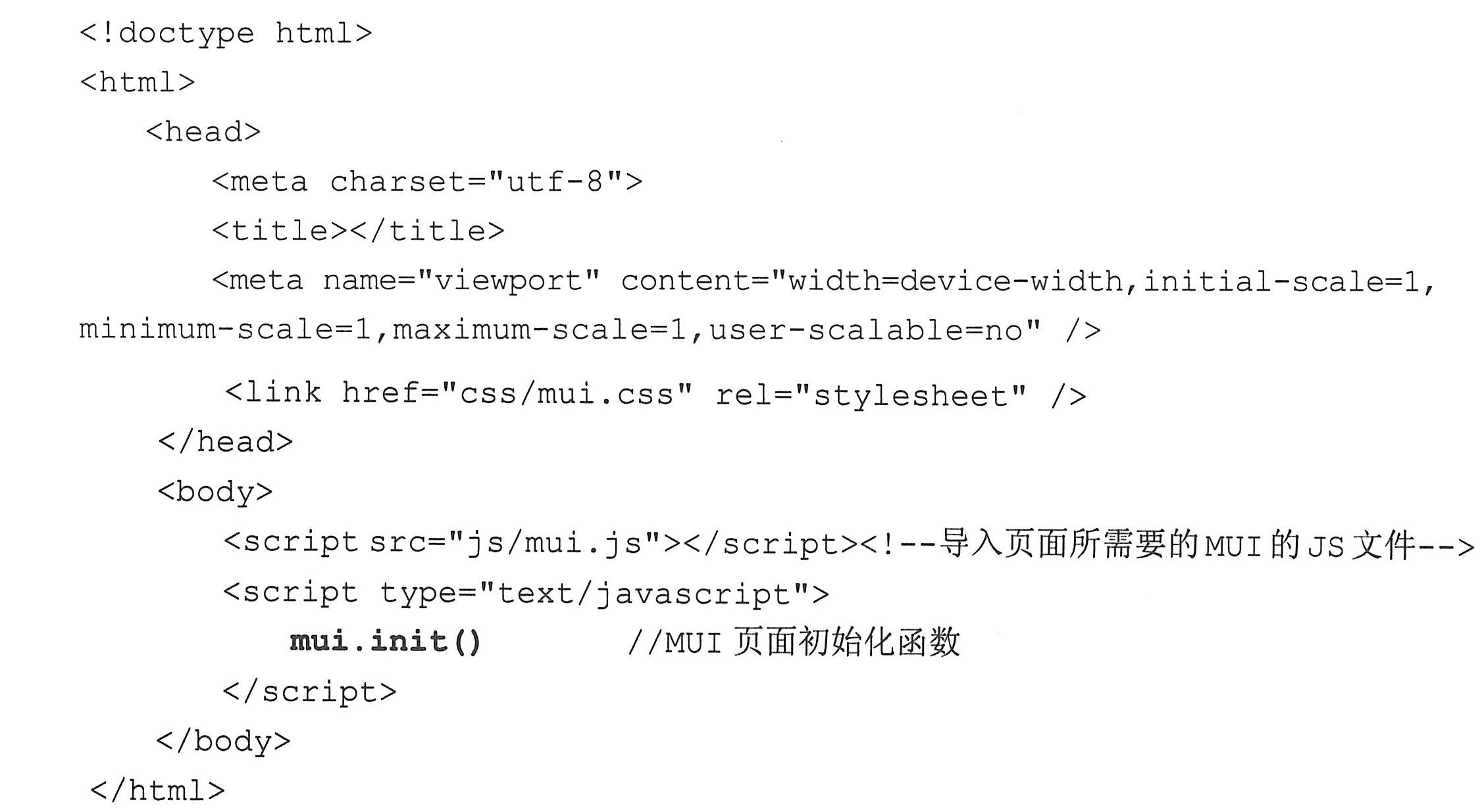 (3)生成含MUI的html文件。在新建HTML文件时,选择“含MUI的html”,就可以生成以MUI架构为基础的网页文件,代码如下所示: