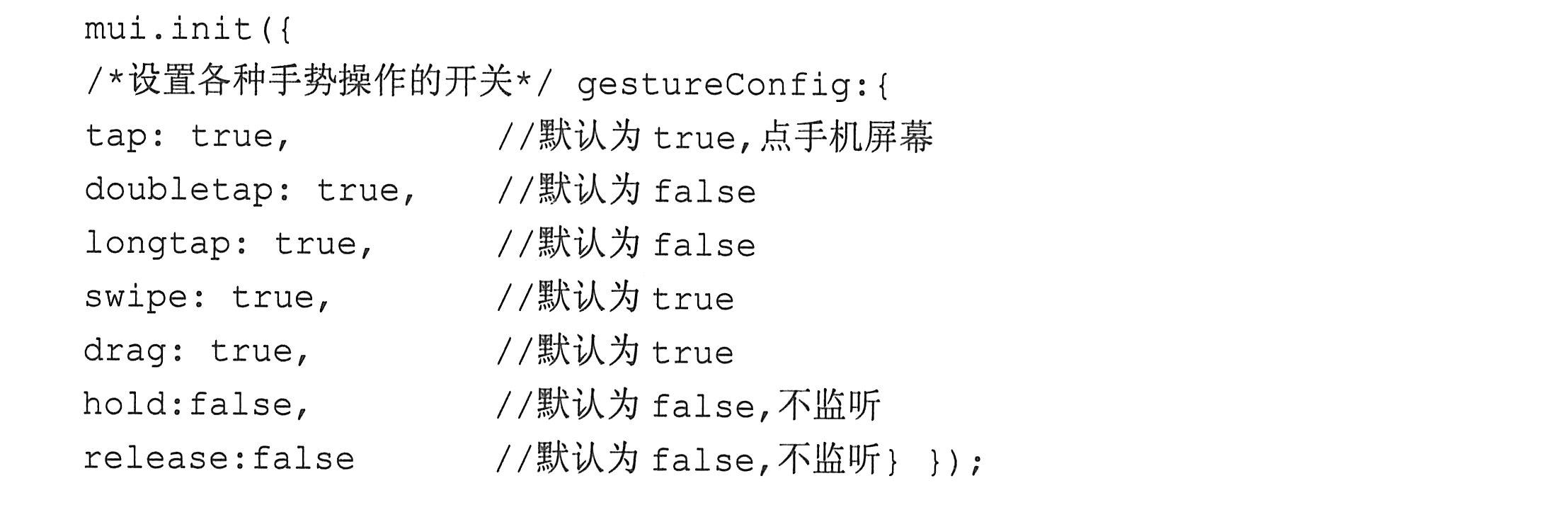这里mui.init()初始化函数,接收一个对象参数,用于进行页面的各种配置,例如子页面的加载、页面预加载等。如下代码,设置手势: