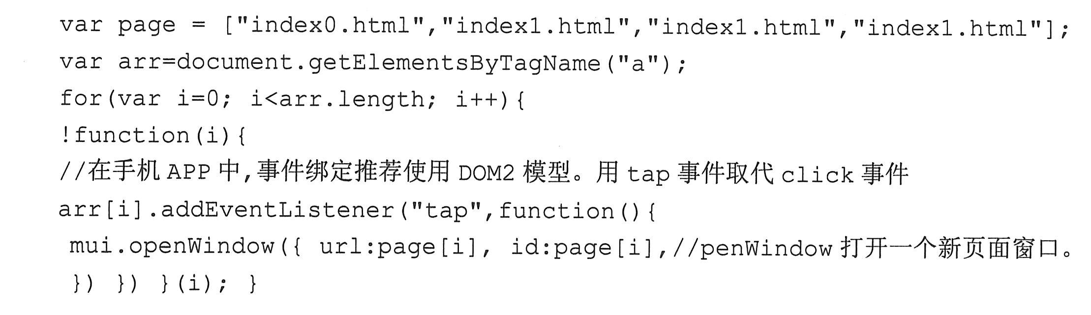 (4)搭建首页HTML布局。首先在body中输入“m”选择mHead,生成头部导航栏,然后在导航栏下面,输入mbody,生成页面的主体部分,其实就是一个div。页面中除了Header和Footer以外的全部内容,必须包含在body中。接着在body中,输入一个个元素,例如添加一个列表mList等。最后为每个元素添加事件,例如添加跳转页面,这里和JSP类似,要调用mui.plusReady(function(){绑定事件})函数,例如一个列表的每项实现到下一个页面的跳转,如下代码: