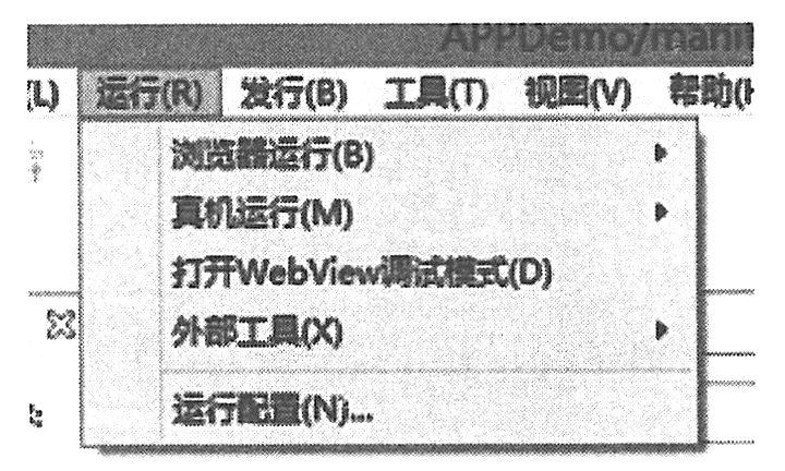 (5)模拟运行。在开发过程中完成某一功能,就可以进行调试,HBuilder支持多种方式,可以直接通过浏览器调试,也可以通过手机运行或通过模拟器调试,如下图所示。