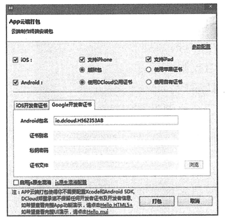 (6)打包WebApp。一旦开发测试完成,就可以应用打包工具生成Andriod的APK文件和iPhone的IPA文件。单击HBuilder菜单导航栏的“发行”→“原生App”-“云打包”,可以看到如下图所示的对话框,打包过程非常简单,这也是HBuilder得到广泛应用的优势之一。
