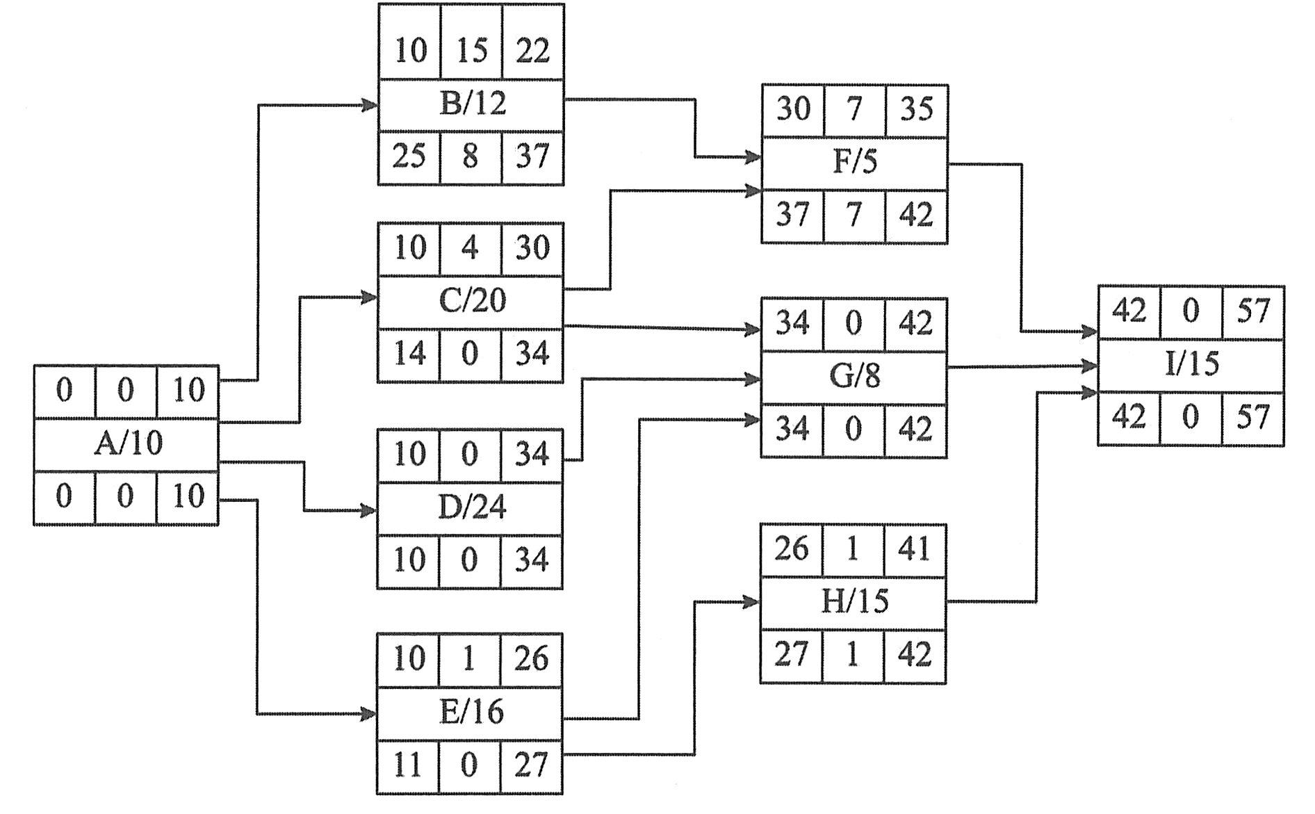又如,如下图所示网络图中,任务名称为A、D、G和I的总时差为0,因此该项目的关键路径是A—D—G—I。