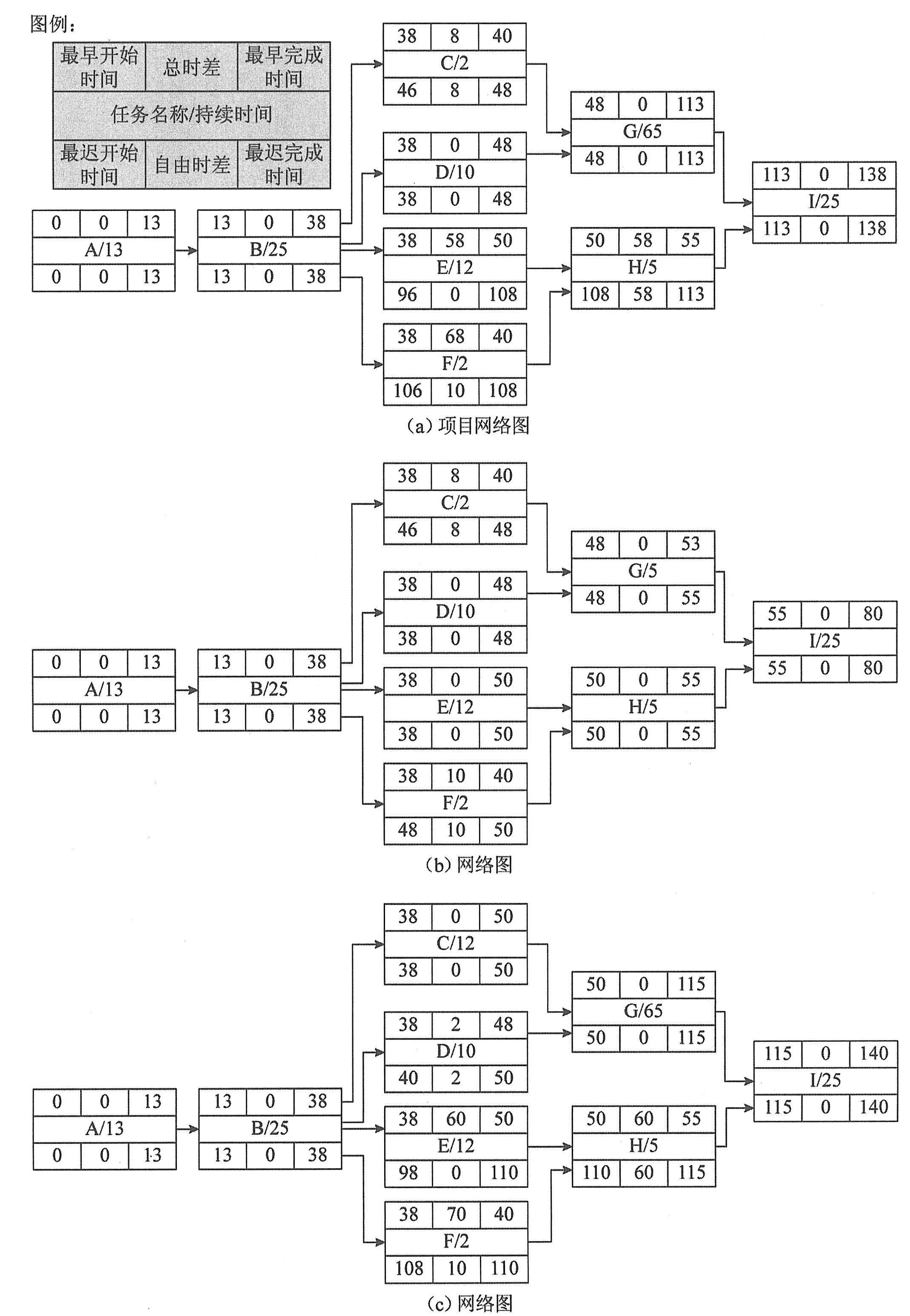 利用时差缩短工期指利用非关键工作的时差,用其中的部分资源加强关键工作,以缩短关键工作的持续时间,使工期缩短。采用这一措施,关键线路可能会不断地发生转移。①对于关键路径,其上任何工作的作业时间变化,都会引起后续各工作的最早开始时间、最迟开始时间以及时差的变化,并有可能出现关键线路转移。如下图(a)中,原关键线路为A、B、D、G、I,若G的工作时间缩短为5天,则关键线路转移为:A、B、E、H、I,如下图(b)所示;②对非关键路径:若其上某些工作的作业时间若延长,但不超过时差范围时,则不致影响整个项目进度,计划也就不必调整,如下图(a)中,作业C的时间由2变为8,虽增加了6,但小于时差8,则关键线路不变;若其上某些工作的作业时间延长而且超过了时差范围,则势必带来整个项目进度的变化,关键线路就会转移。如下图(a)中,若C的时间由2变为12,增加了10,大于时差8。重新计算参数发现,关键路径转移为A、B、C、G、I,如下图(c)所示。
