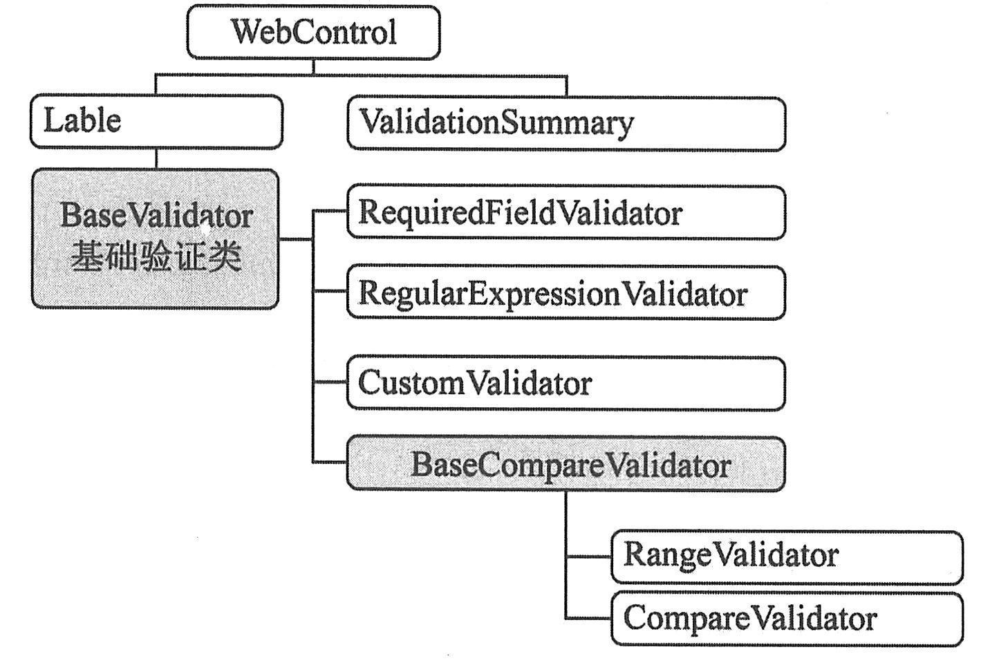 在浏览运行网页时,经常会遇到用户登录、用户注册等情况,这时,有一些内容是必填项,例如用户名和密码等,这通常先要做有效性验证,再执行相应的程序。在ASP.NET中,可以使用验证控件在客户端浏览器页面上进行验证,只有验证通过的才可以被发送到服务器。ASP.NET中包含多种验证控件,其层次结构如下图所示。