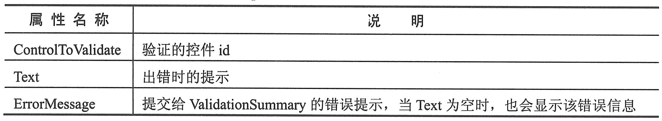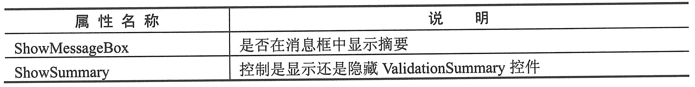 ValidationSummary验证组控件能够对同一页面的多个控件进行验证。同时,验证组控件通过ErrorMessage属性为页面上的每个验证控件显示错误信息,其常用属性如下表所示。