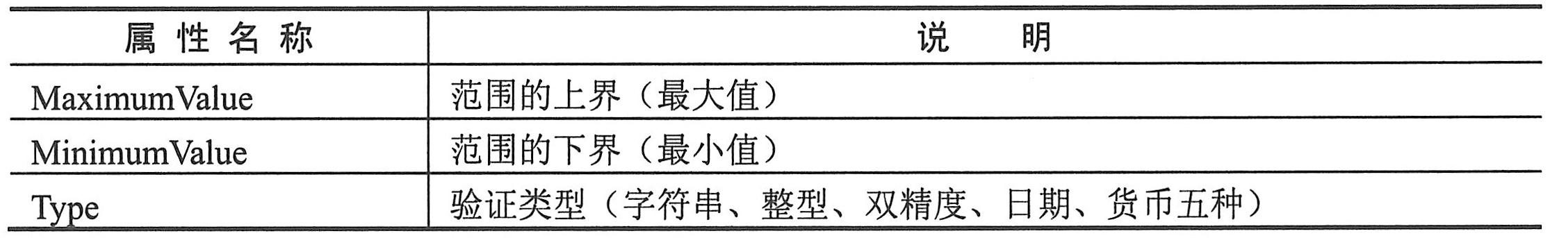 RangeValidator控件可以检查用户的输入是否在指定的上限与下限之间。通常情况下用于检查数字、日期、货币等。范围验证控件的常用属性如下表所示。