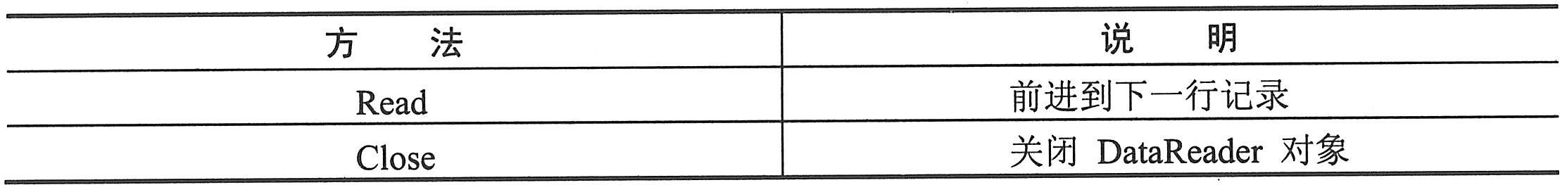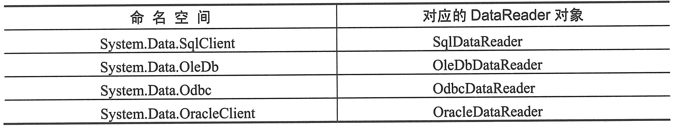 DataReader对象可以产生只读,只进的数据流,这些数据流都是从数据库返回的。所以,每次的访问或操作只有一个记录保存在服务器的内存中。相比DataSet而言,DataReader具有较快的访问能力,并且能够使用较少的服务器资源,DataReader具有快速的数据库访问。.NET针对不同类型数据库提供了多种DataReader对象,如下表所示。