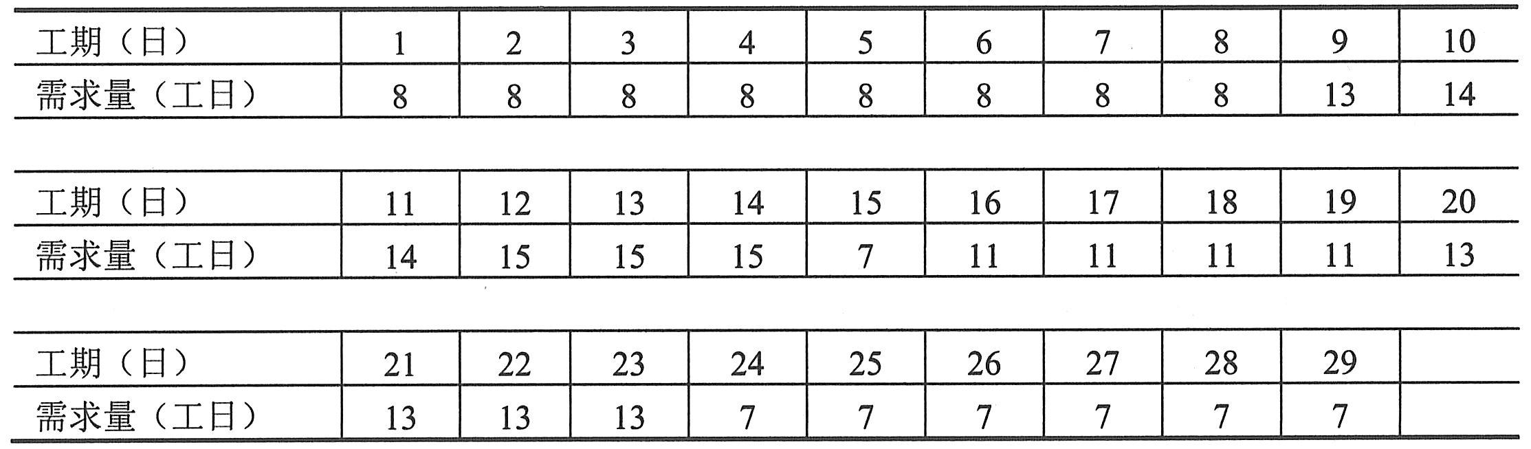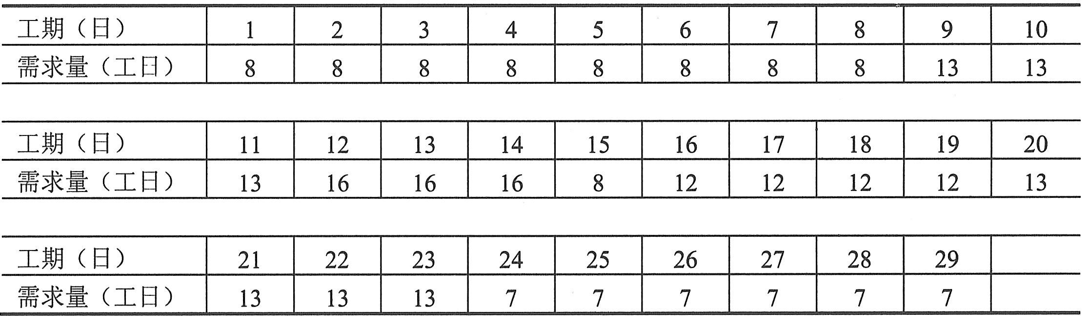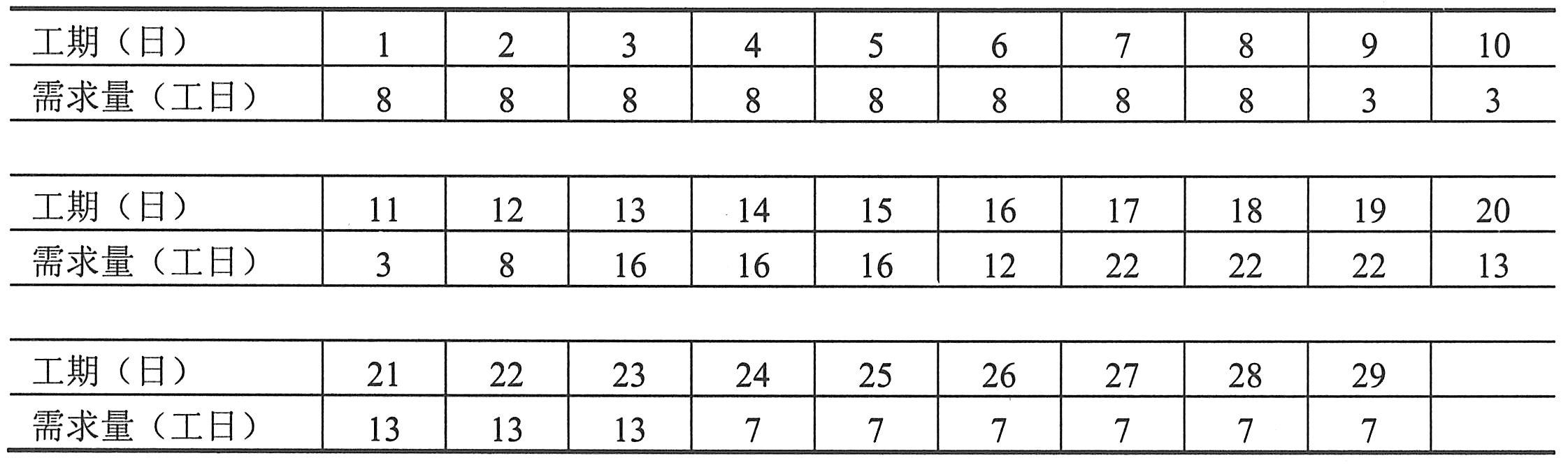 我们假定项目中只使用了人力资源且不考虑项目资源使用率,则总劳动时数=每天需要的劳动力×工作持续时间。下表给出了资源需求情况表。