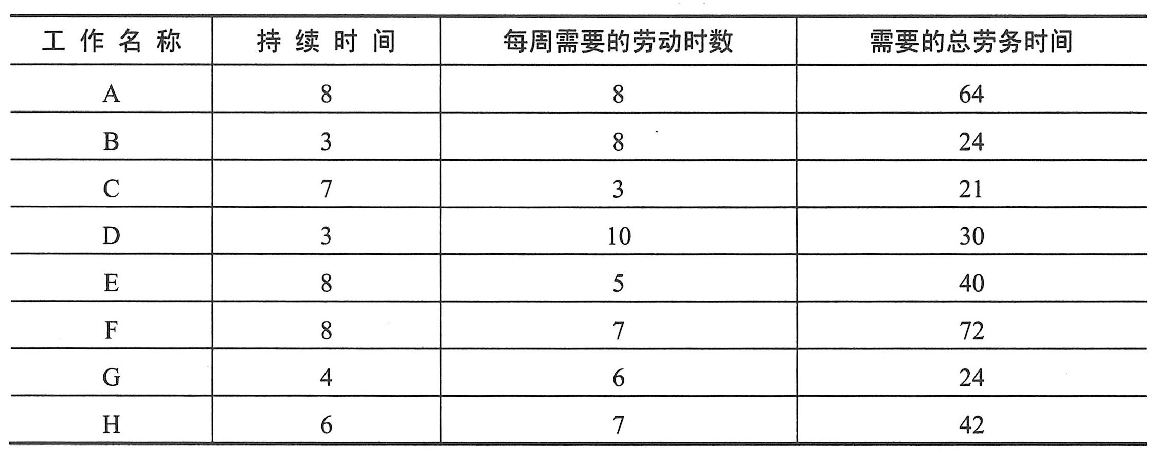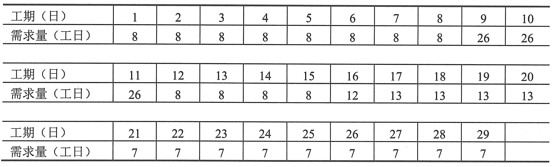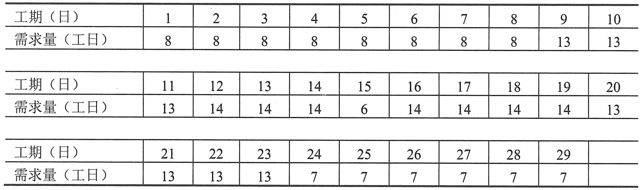 我们假定项目中只使用了人力资源且不考虑项目资源使用率,则总劳动时数=每天需要的劳动力×工作持续时间。下表给出了资源需求情况表。