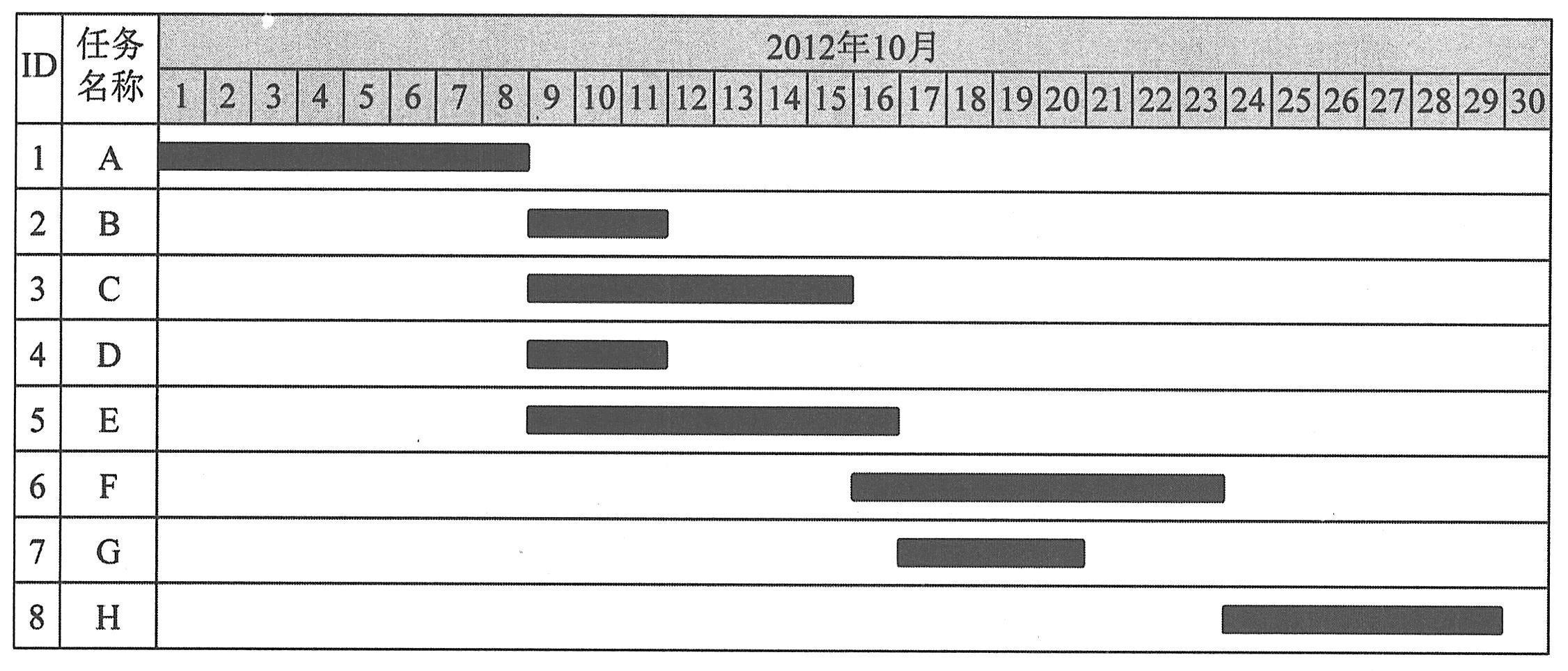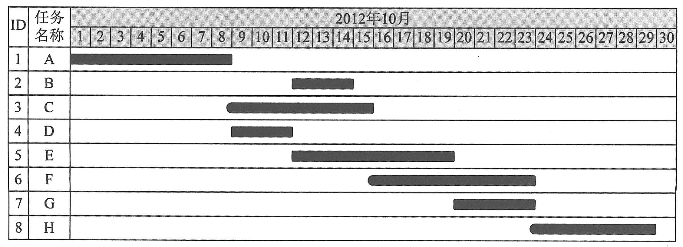 现在,分别以最早开始进度计划和最迟开始进度计划为基础,分析资源均衡问题。下图一和下图二分别列出了按照项目最早和最迟开始时间的进度计划甘特图。