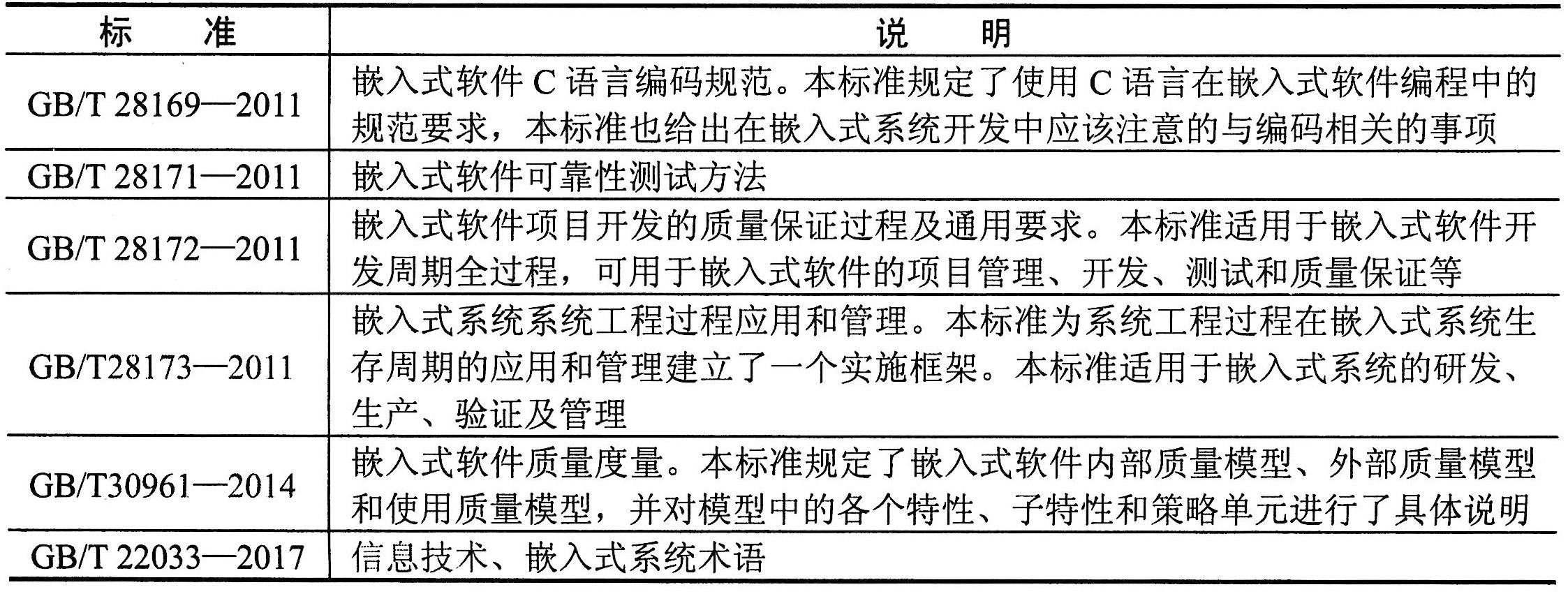 针对嵌入式系统的不同的应用领域有各种相关标准,如:GBZ 33013—2016道路车辆车用嵌入式软件开发指南,GB/T 30413—2013嵌入是LED灯具性能要求等,在此不再赘述。