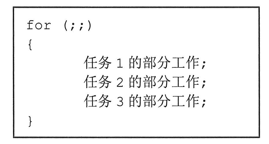 在具体实现上,无操作系统的嵌入式软件主要有两种实现方式:循环轮转和前后台系统。
