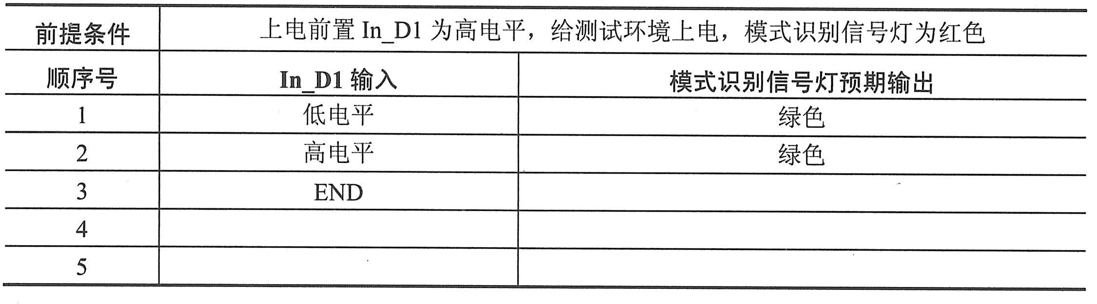 2.如果不考虑约束,软件工作状态从组合的角度来说,上表的测试顺序完全符合要求。但是许多软件在实际使用中,由于真实情况的限制,不能从理论的情况进行组合,对一些条件必须要进行约束。例如本题中,在单次进入正常工作模式后,就不能进入维护模式,因为维护模式是一种检修模式,不能再正常工作中,进行检修,所以必须保证在正常工作模式下,对维护模式命令不响应。所以此题的前提条件应该为“上电前置In_D1为高电平,给测试环境上电,模式识别信号灯为红色”,即在上电后首先让工作模式为维护模式;然后再发送进入正常工作模式命令,灯变绿,进入工作模式;最后在正常工作模式下,发送进入维护模式命令,此时软件应该不响应,灯继续为绿色,表示在工作模式,完成带约束条件的状态转换测试。如果此题继续上表的测试前提条件,不管发送什么命令,灯一直不会变化,就无法判断是软件问题还是测试设备问题,无法完成测试。完善后的下表如下。