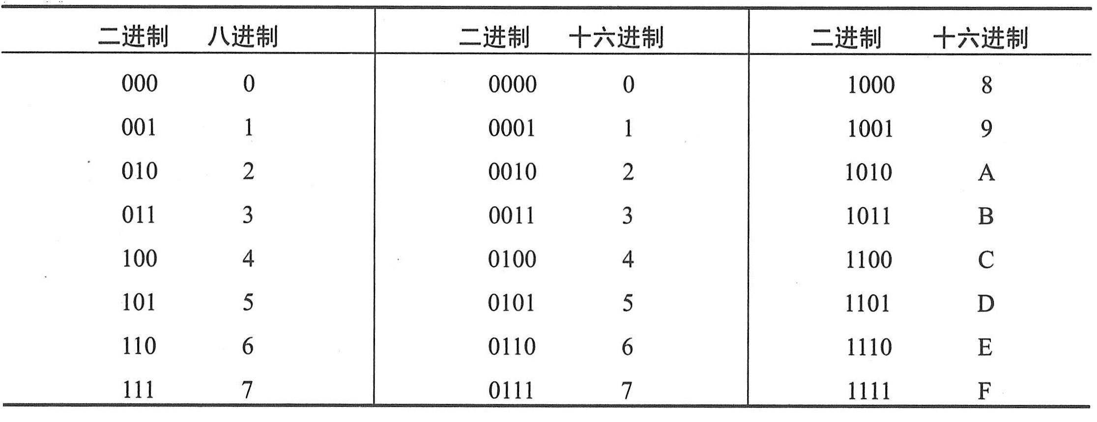 二进制与八进制数、十六进制数之间的对应关系如下表所示。