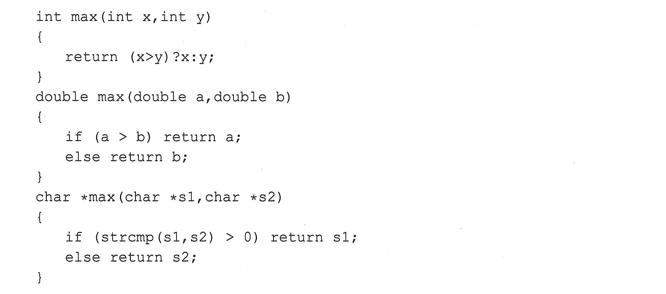 上面定义了三个名称为max的函数,它们的参数和返回值类型都不同。在程序中若有对max函数的调用,编译器将根据参数形式进行匹配,如果找不到对应参数形式的函数定义,编译器给出错误信息。