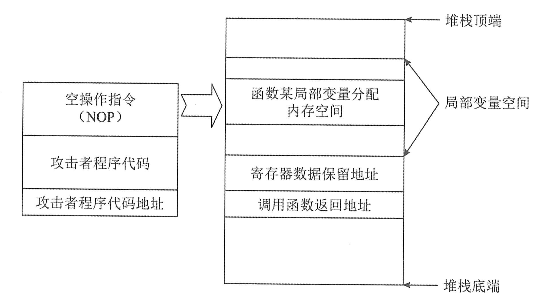 缓冲区溢出攻击可以使攻击者有机会获得一台主机的部分或全部的控制权。据统计,缓冲区溢出攻击占远程网络攻击的绝大多数。缓冲区溢出成为远程攻击主要方式的原因是,缓冲区溢出漏洞会给予攻击者控制程序执行流程的机会。攻击者将特意构造的攻击代码植入有缓冲区溢出漏洞的程序之中,改变漏洞程序的执行过程,就可以得到被攻击主机的控制权,如下图所示。