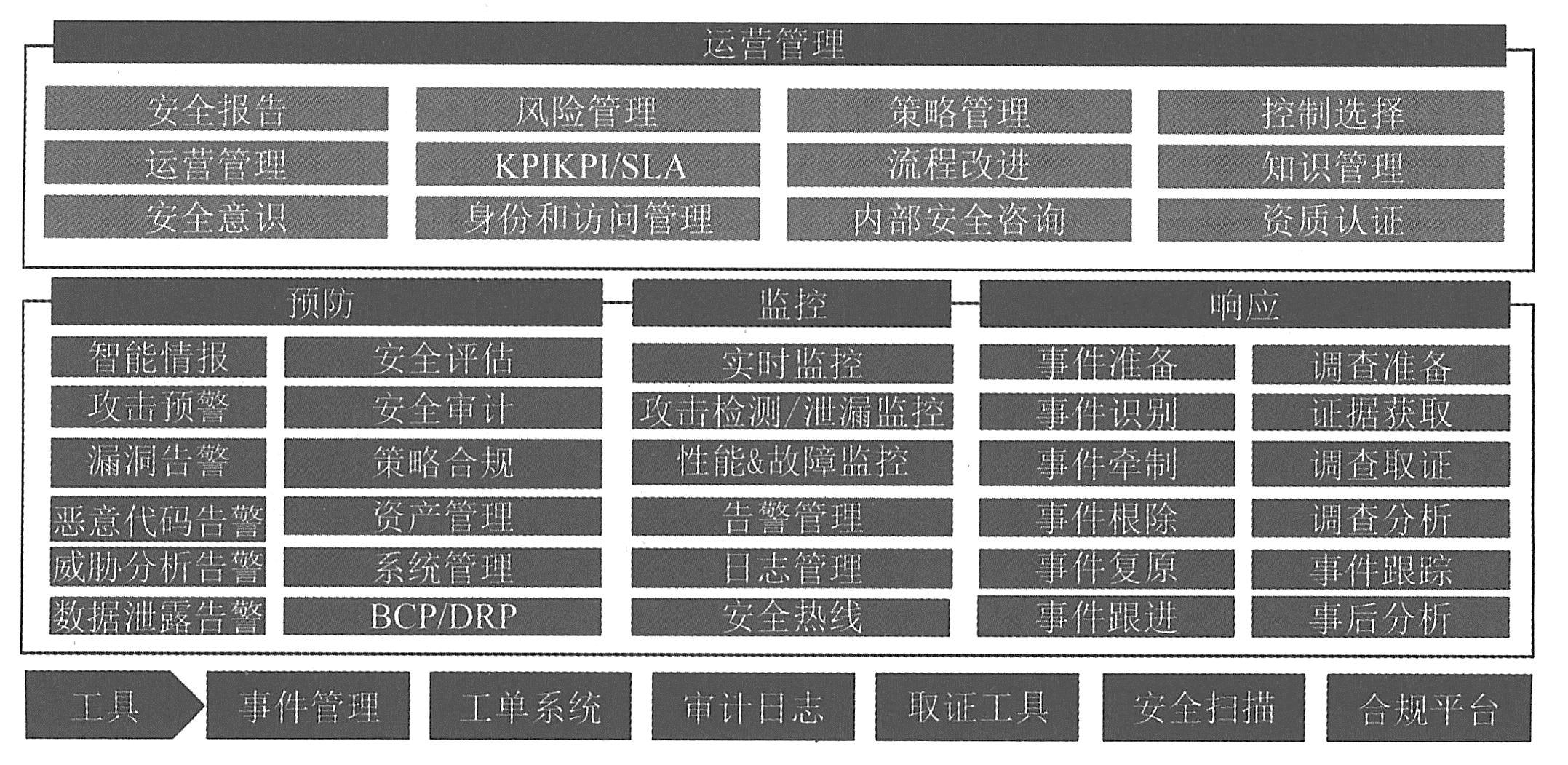 智能交通网络安全运营体系如下图所示,由三个要素组成:运营管理、网络安全事件周期性管理、工具。其中,运营管理的作用是有效衔接安全管理体系和安全技术体系,通过其有效运转实现安全管理体系、安全技术体系的不断优化提升;网络安全事件周期性管理覆盖预防(事前)、监控(事中)、响应(事后),形成自主有效的闭环;工具主要包括事件管理、工单系统、审计日志、取证工具、安全扫描和合规平台等。